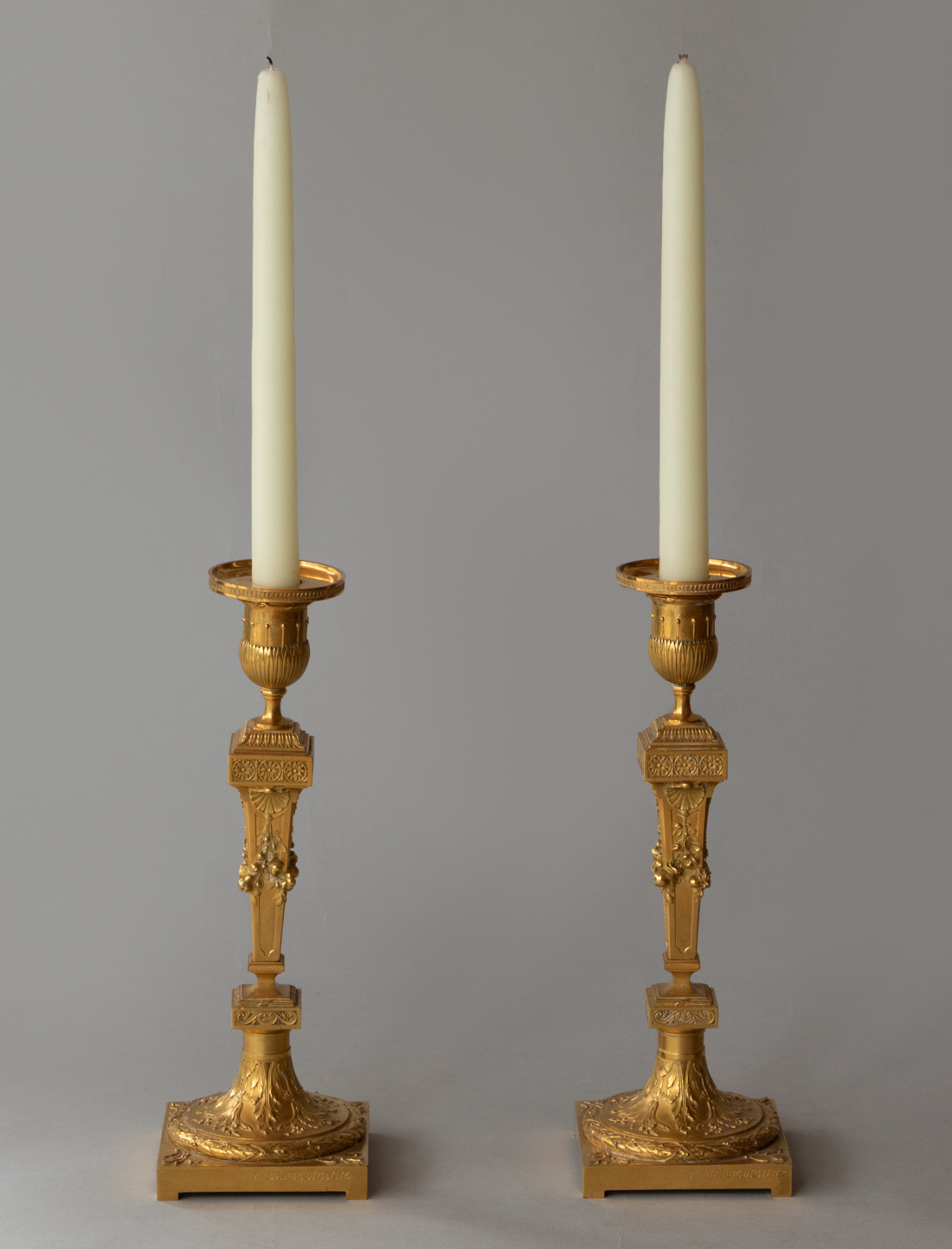 Pair of Louis XVI style 19th century gilt bronze candlesticks. Finely incised with leaf and berry, flower and shell decoration.