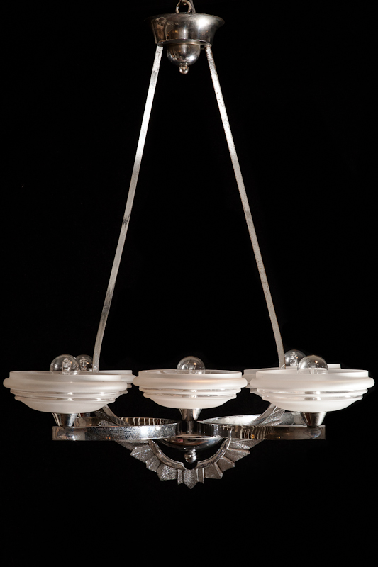 Deco pendant light with with five original glass etched bowls with four arms and a central bowl, supported on chome plated frame, retaining the orginal chromium plating.