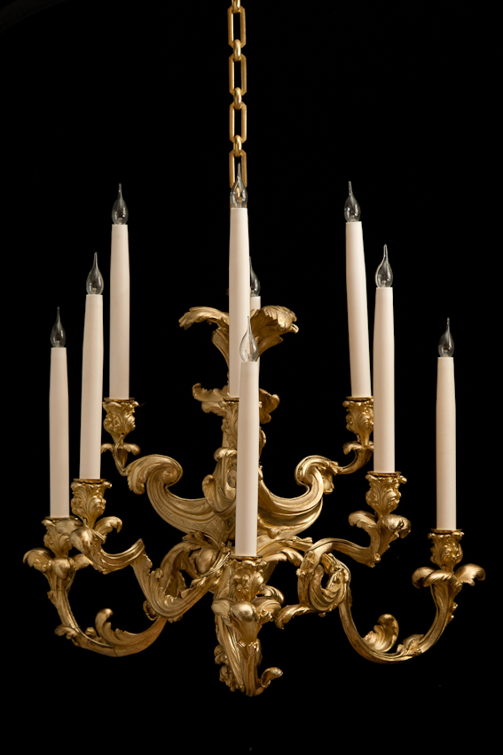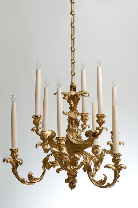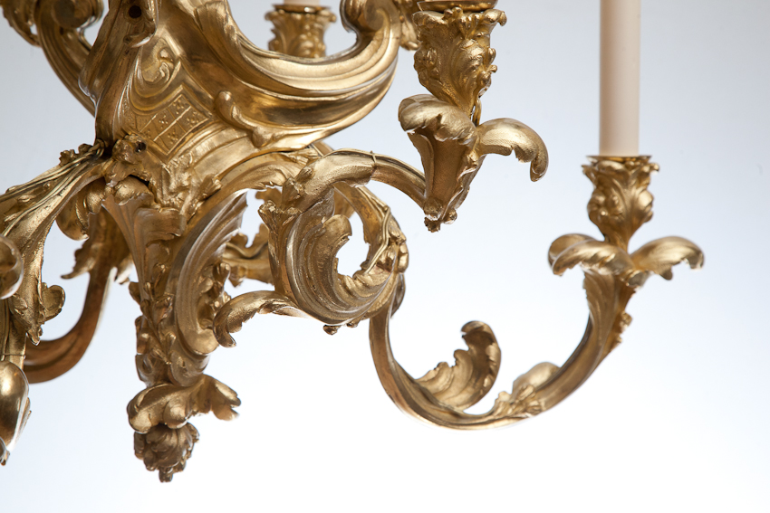 A fine quality highly decorative chandelier, the arms in the form of swirling acanthus leafs in the exuberant Louis XV style.