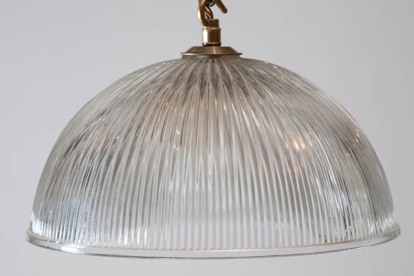 EARLY 20TH ENGLISH OR AMERICAN HOLOPHANE DISH LIGHT Mounted with antiqued brass fittings. Currently electrified for the UK.