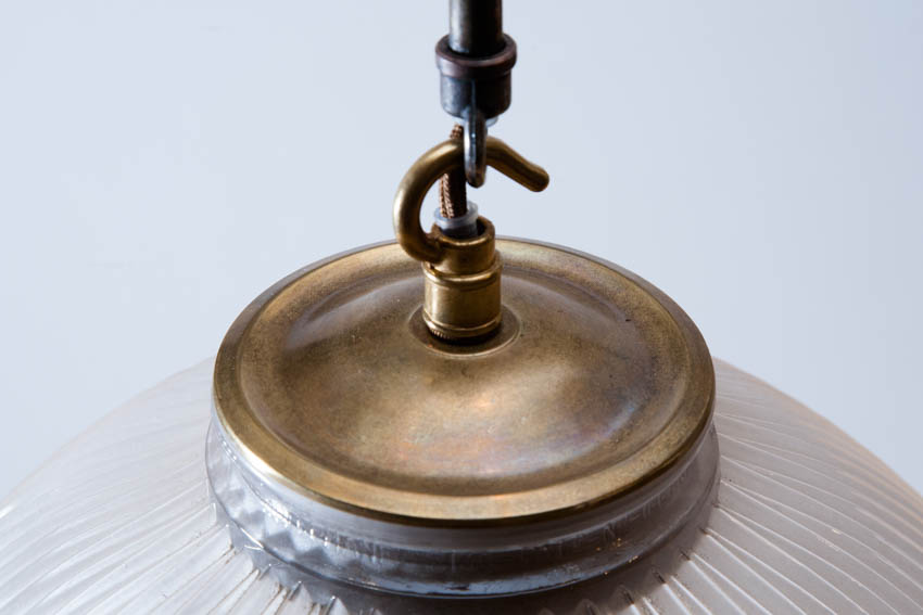 EARLY 20TH ENGLISH HOLOPHANE DISH LIGHT Stamped with a holophane reference number. Electrified for the UK.