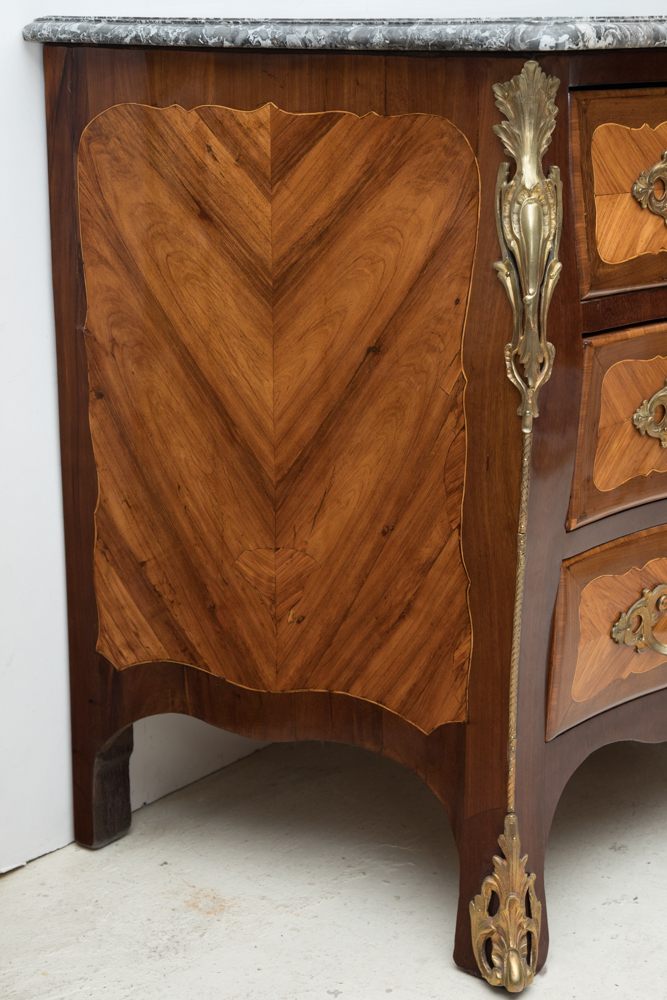 The front angles with gilt bronze rococo mounts on scrolling foliate-cast gently splayed feet. With a shaped Gris Saint-Anne marble top.