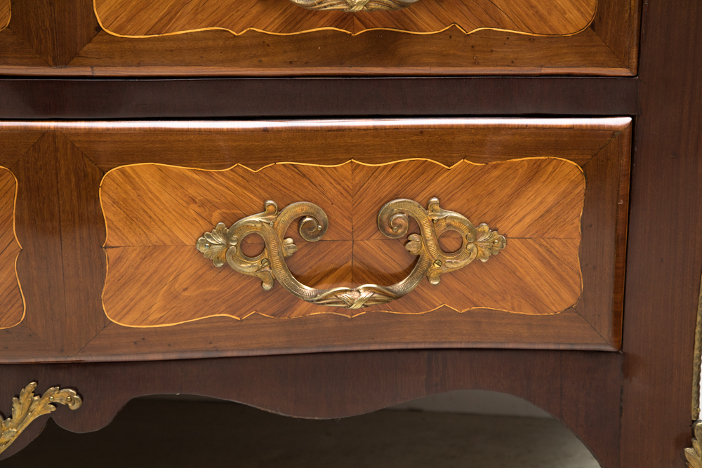 18th century commode with three short drawers over two long drawers. Gilt bronze handles, and escutcheons.