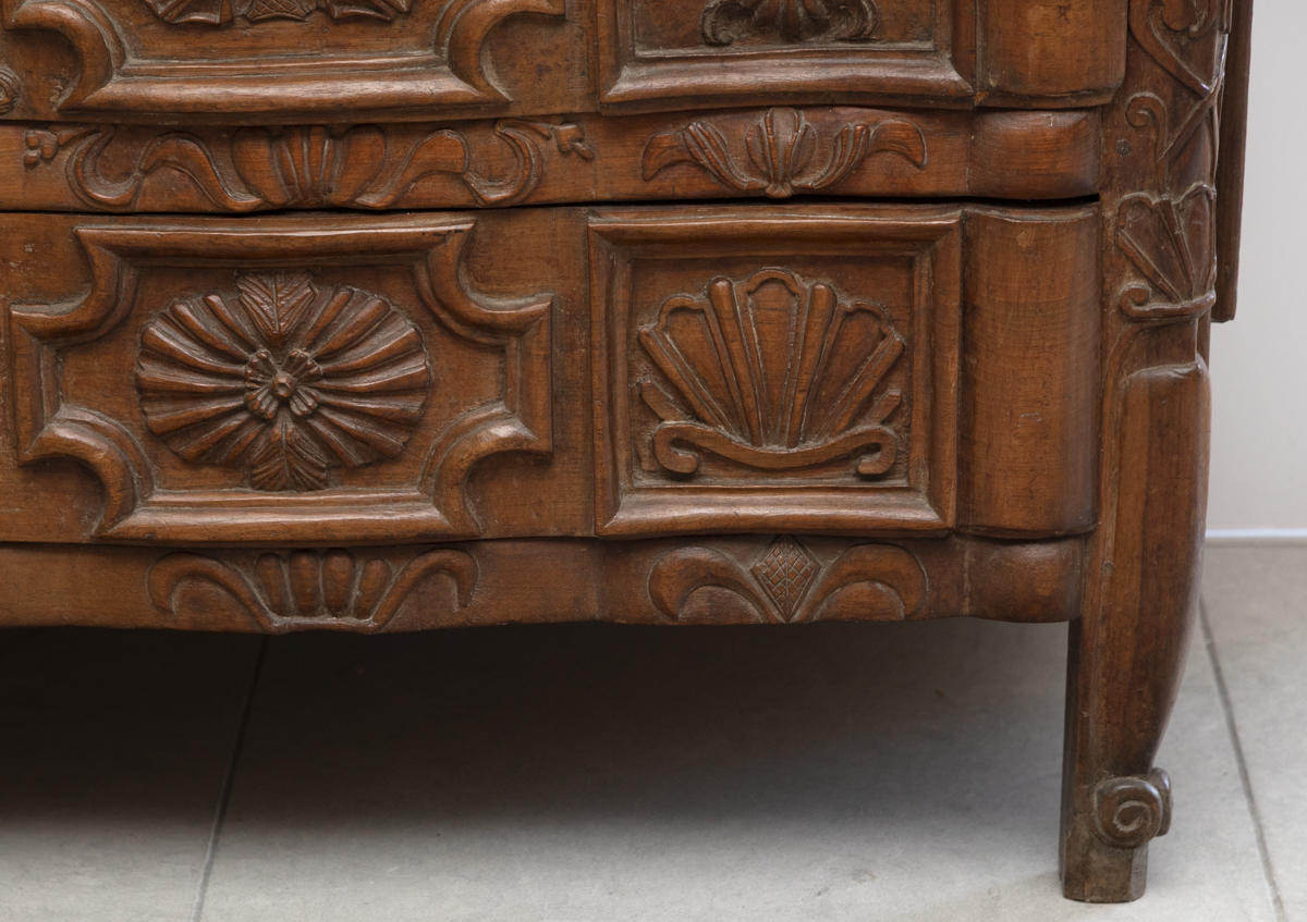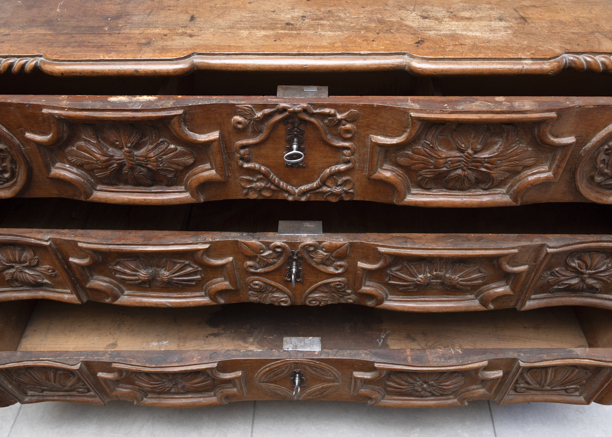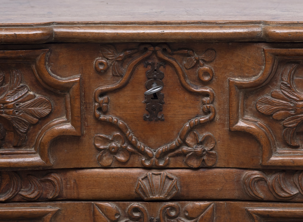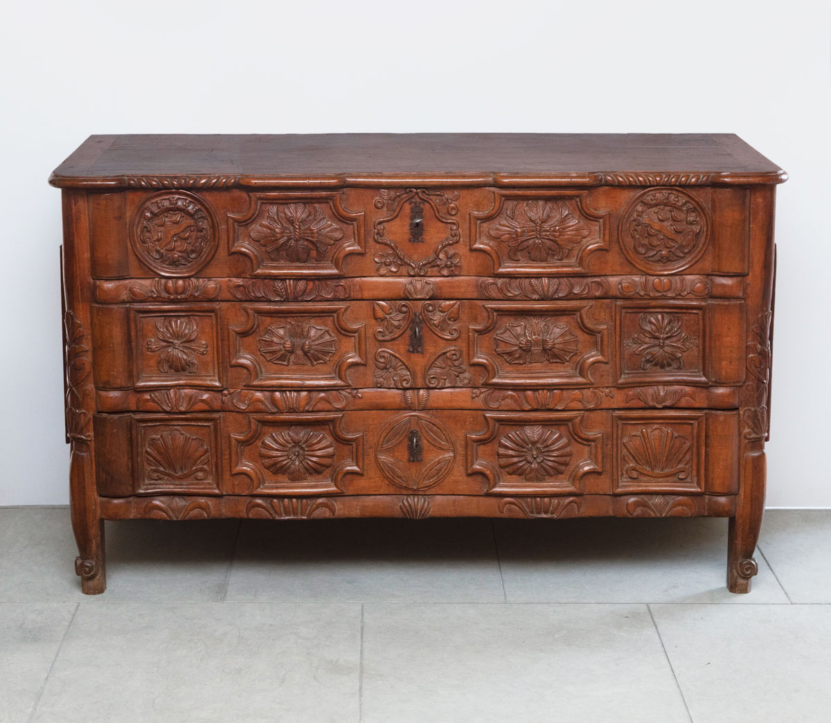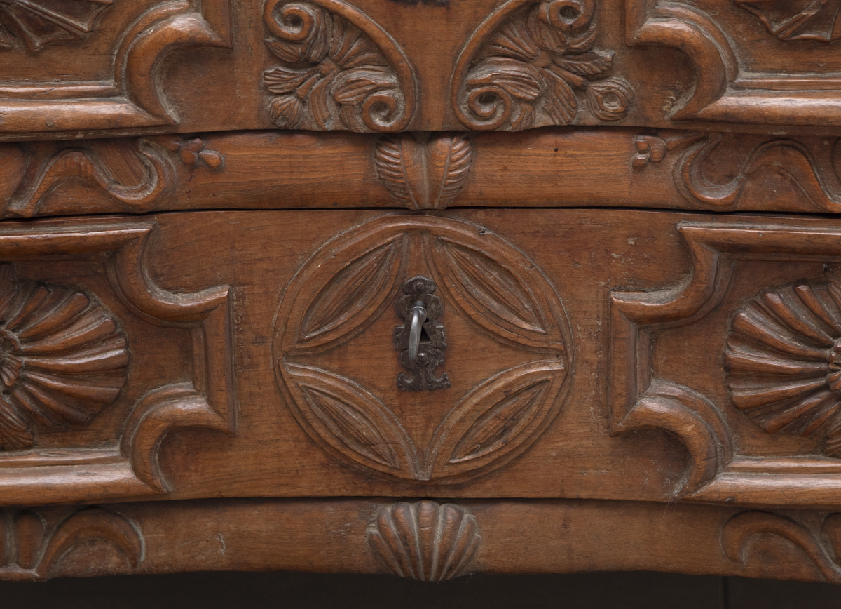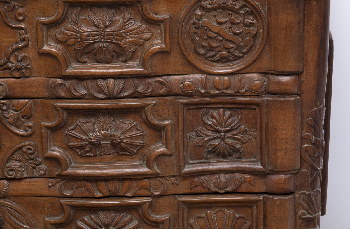 With three long drawers, each divided into five sections with various carvings in relief to include motifs of birds, hearts, flowers, fans, shells and more. The front legs with lighter carving terminating in scrolls, the back legs are square, the sides with a square carved frame. Shaped wooden top with a carved bullnose edge.