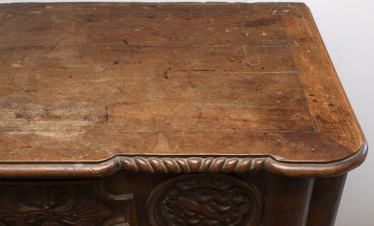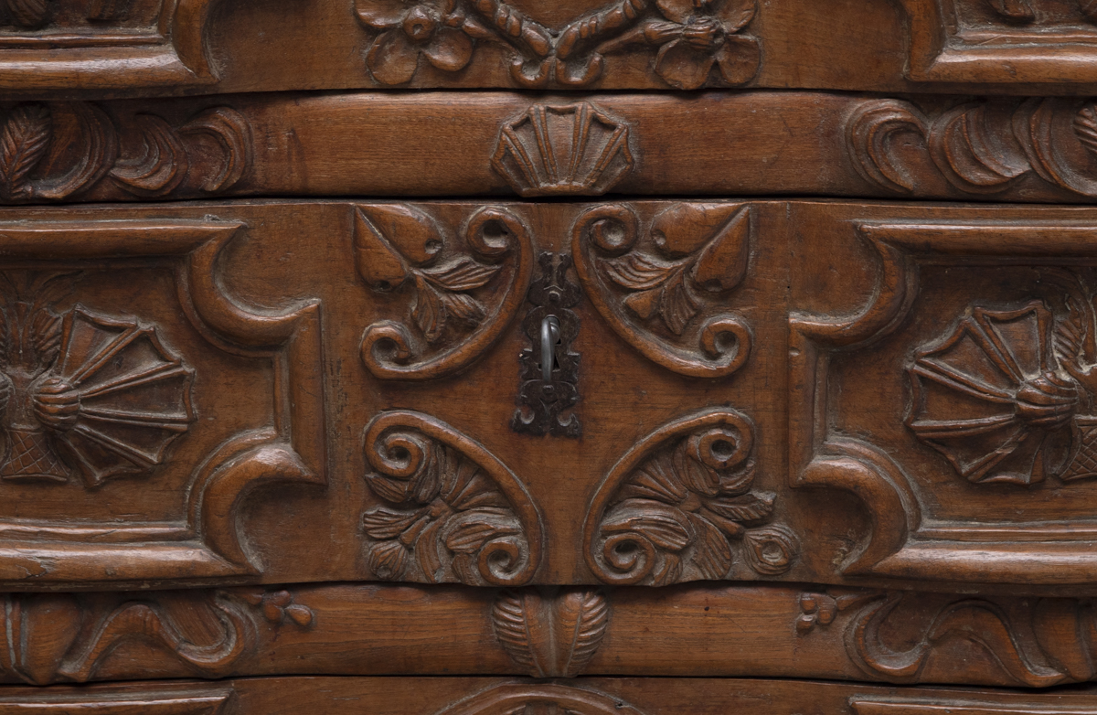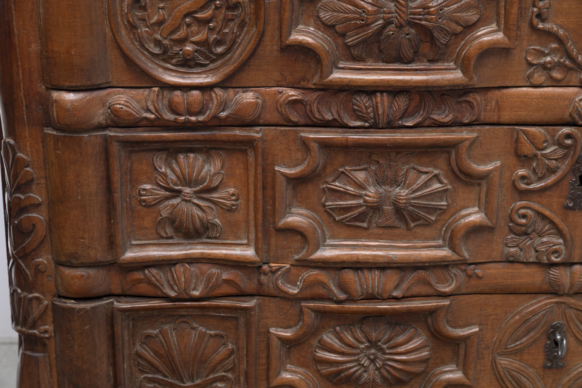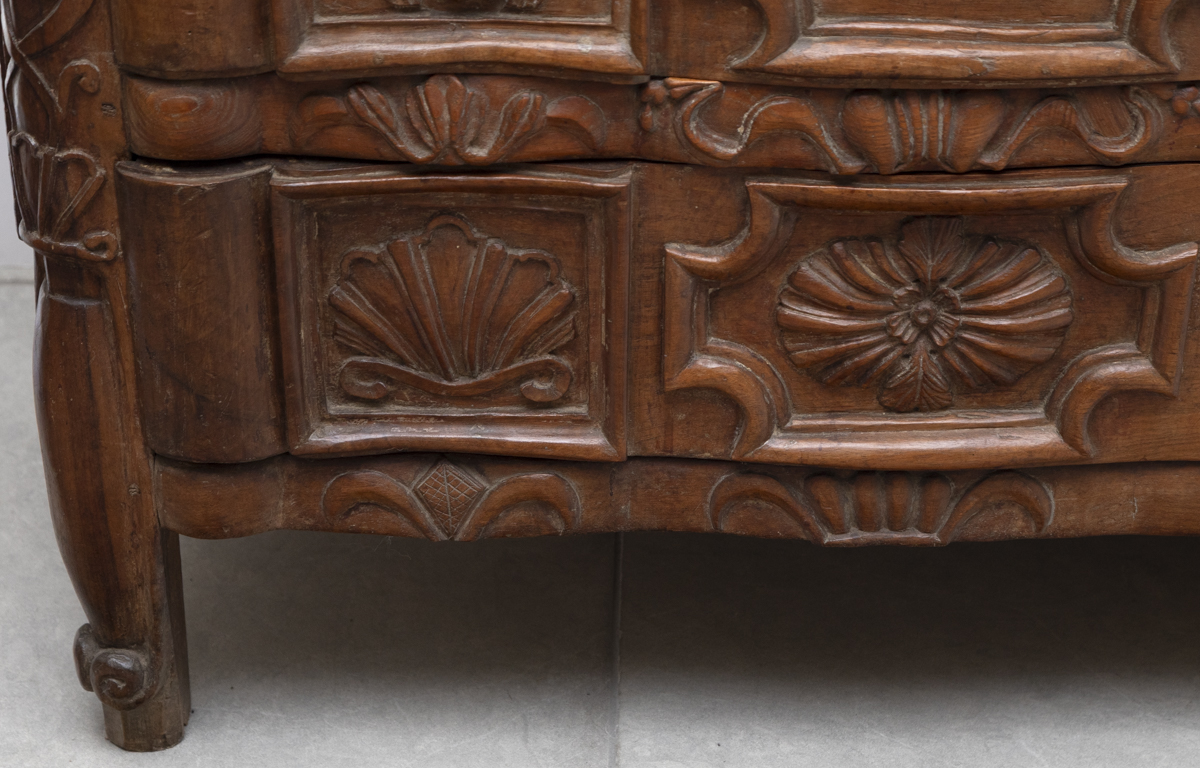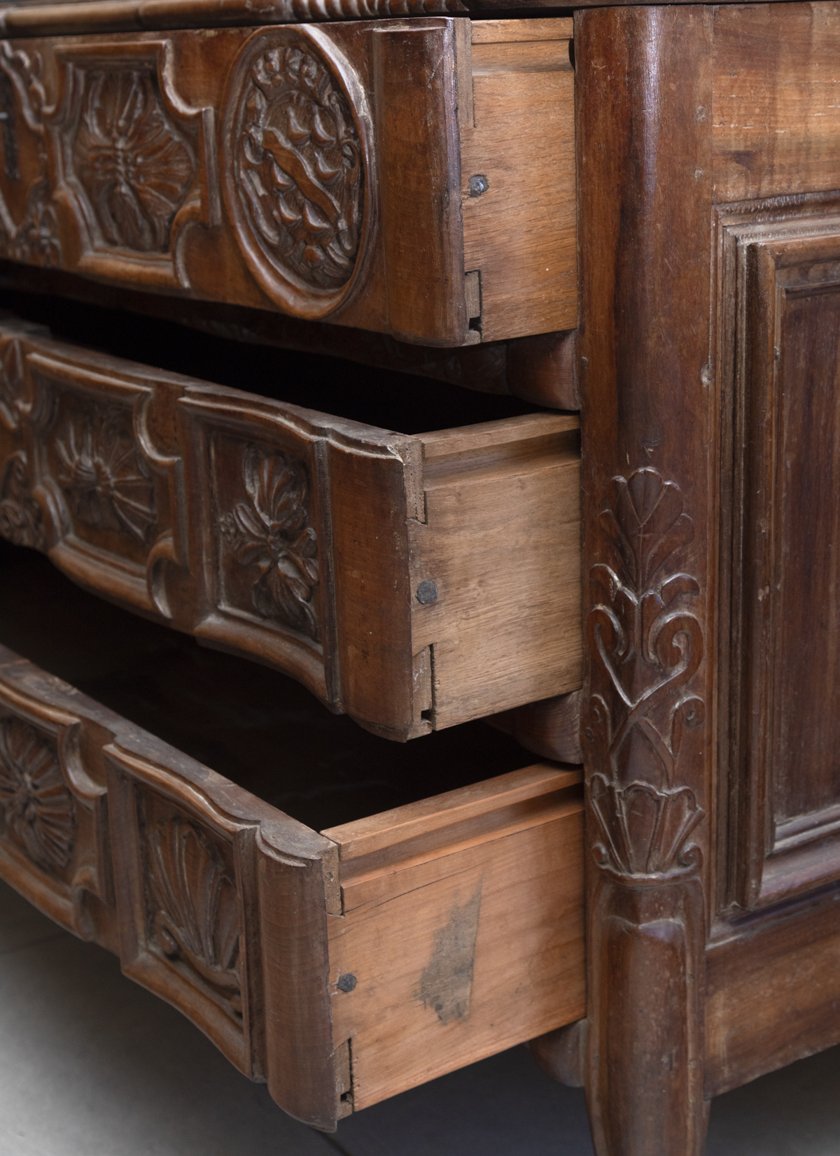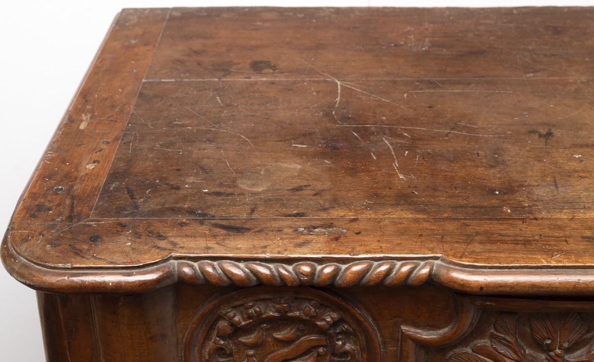 With three long drawers, each divided into five sections with various carvings in relief to include motifs of birds, hearts, flowers, fans, shells and more. The front legs with lighter carving terminating in scrolls, the back legs are square, the sides with a square carved frame. Shaped wooden top with a carved bullnose edge.