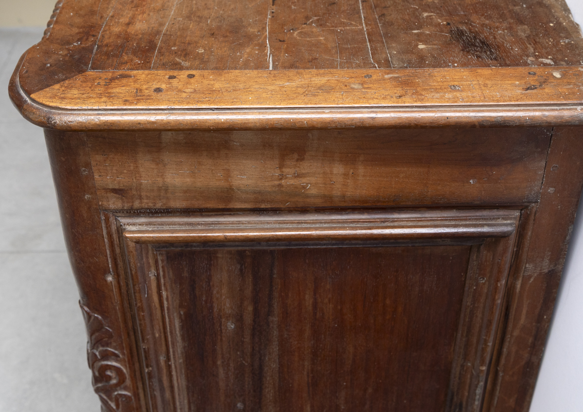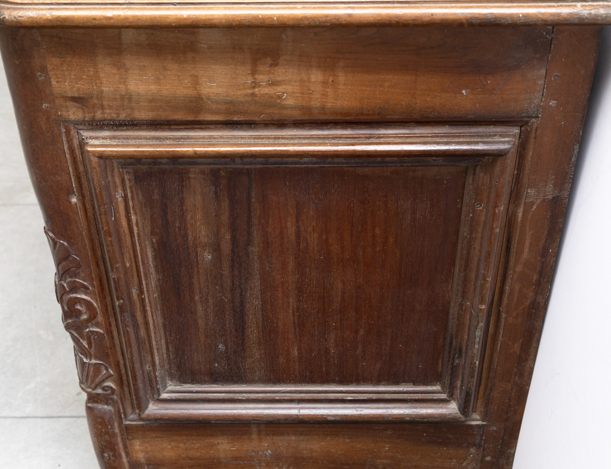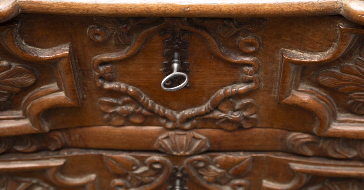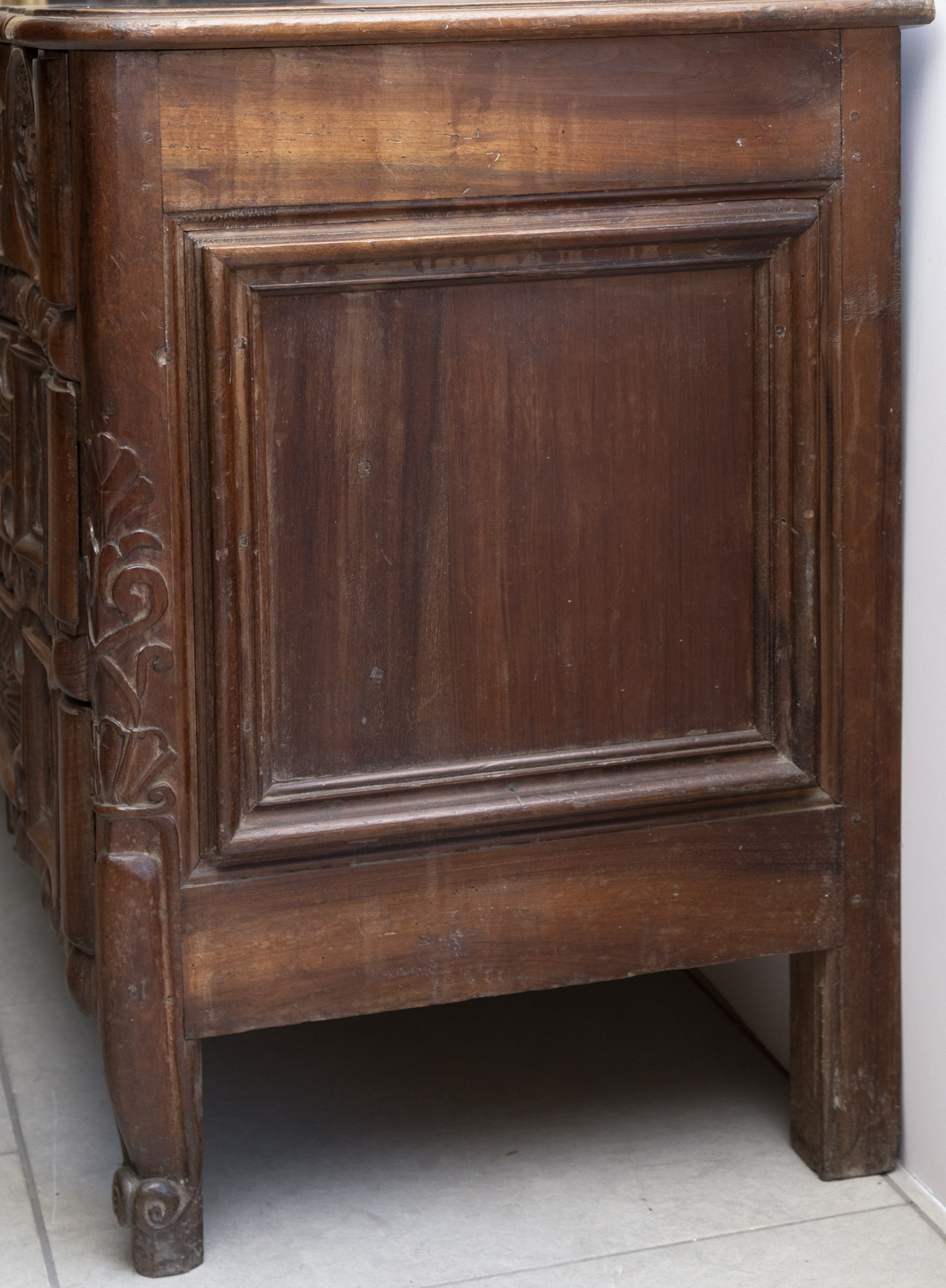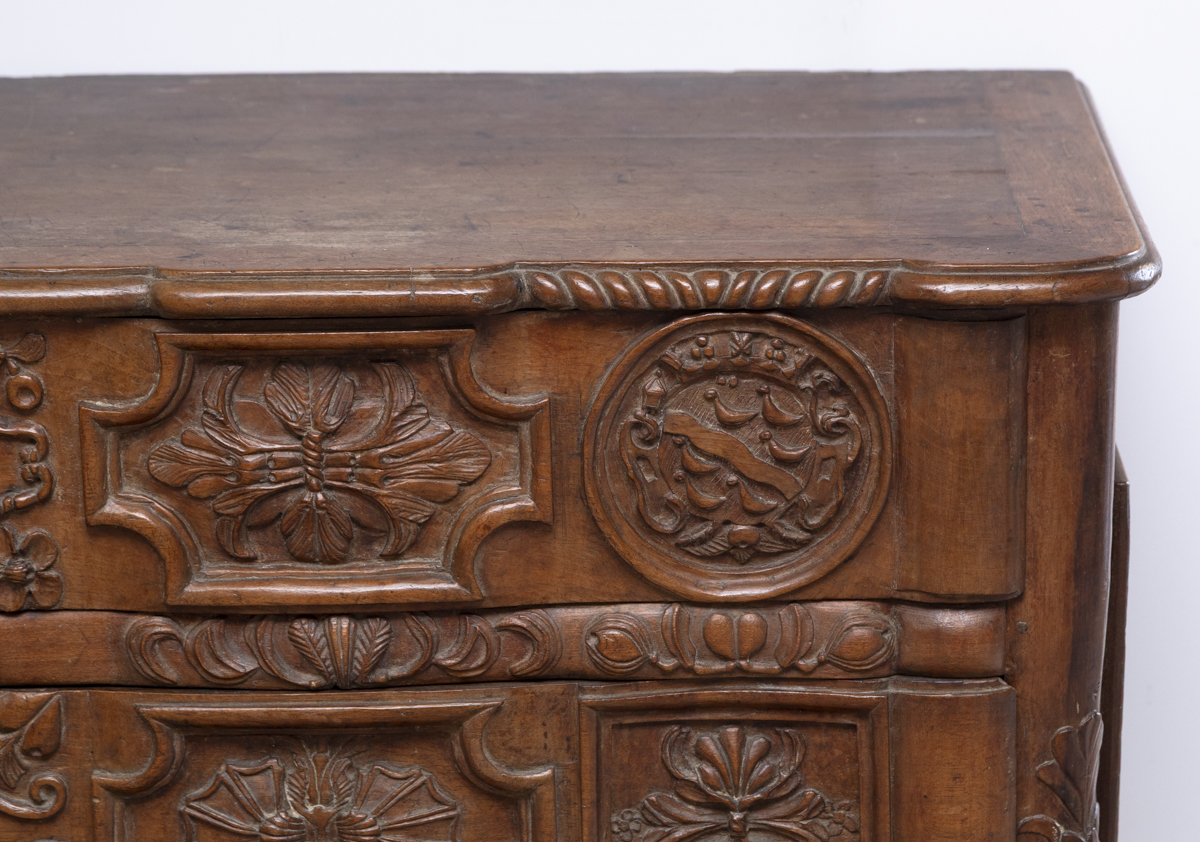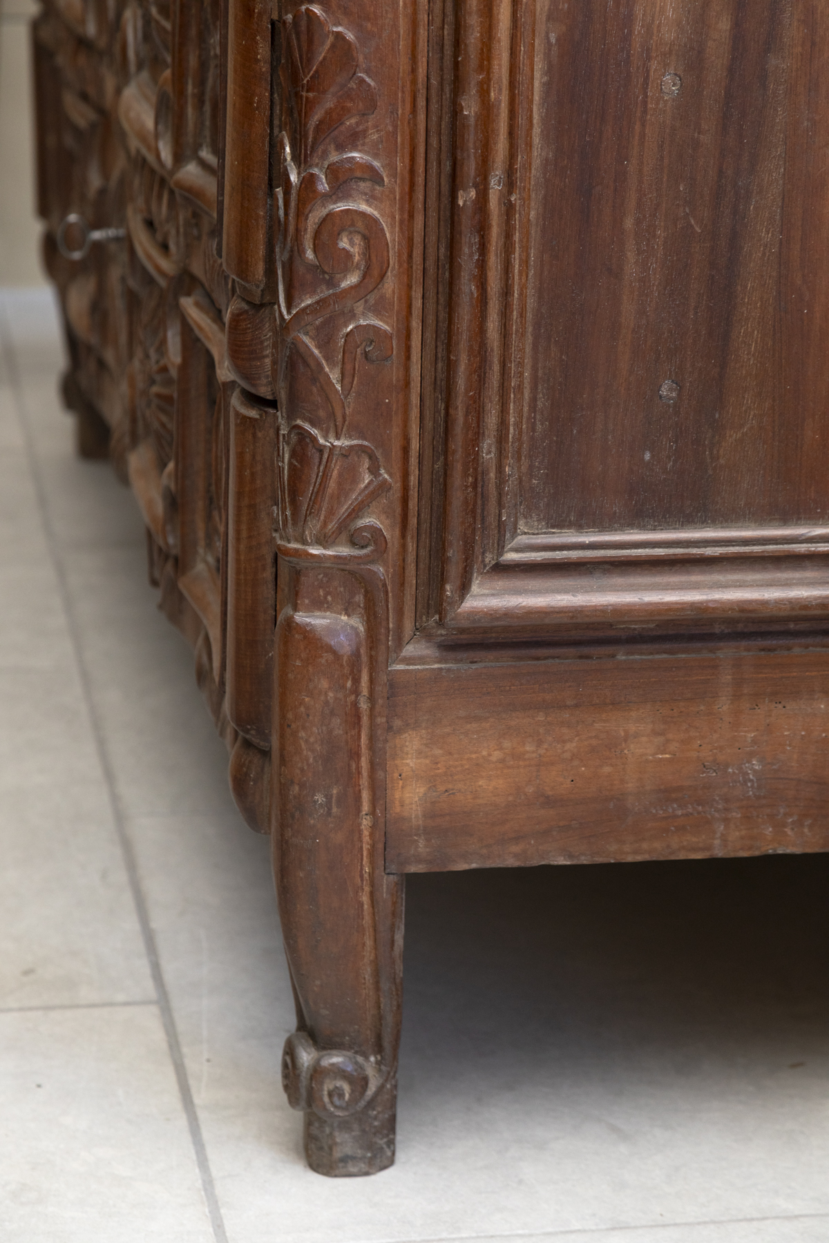 With three long drawers, each divided into five sections with various carvings in relief to include motifs of birds, hearts, flowers, fans, shells and more. The front legs with lighter carving terminating in scrolls, the back legs are square, the sides with a square carved frame. Shaped wooden top with a carved bullnose edge.