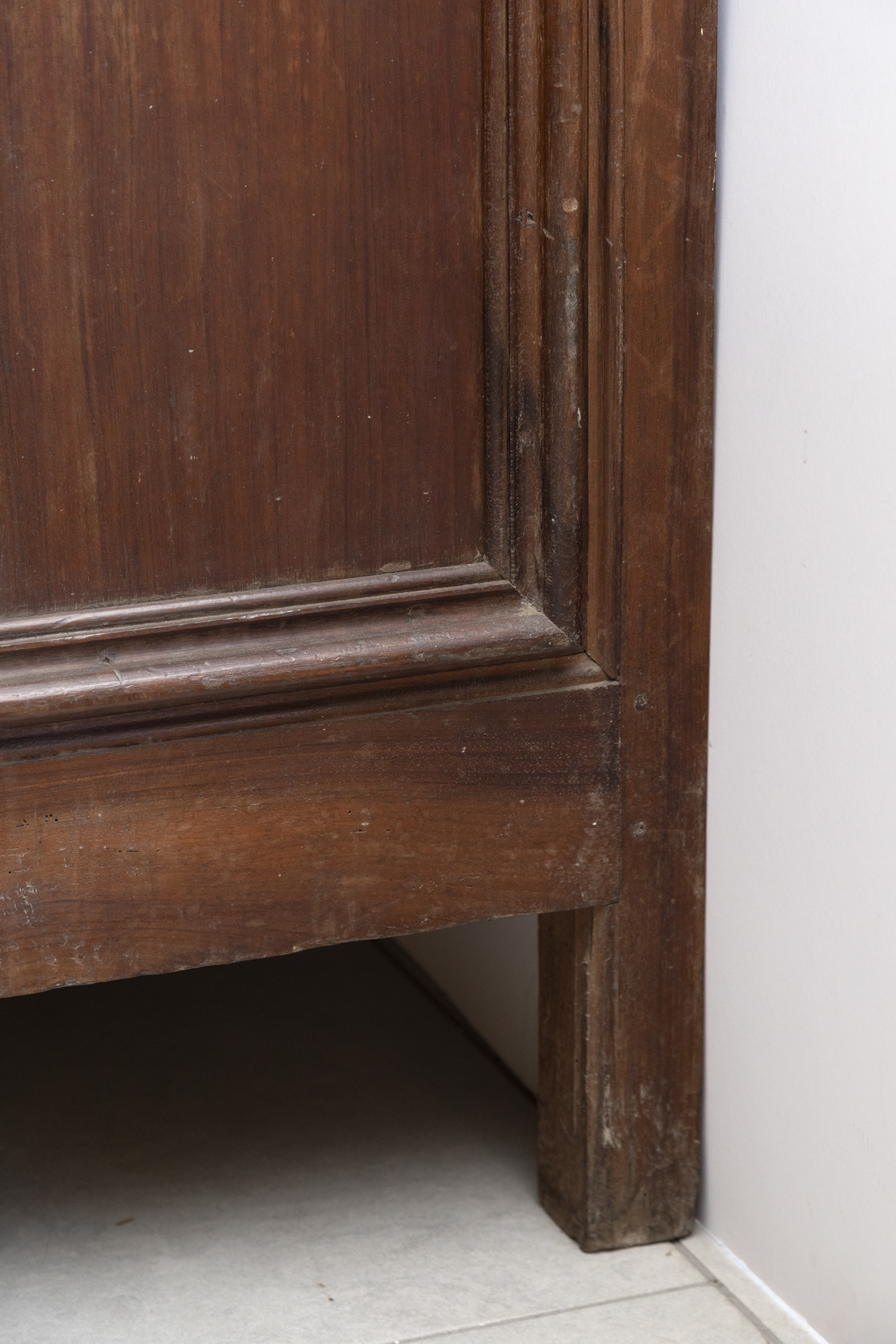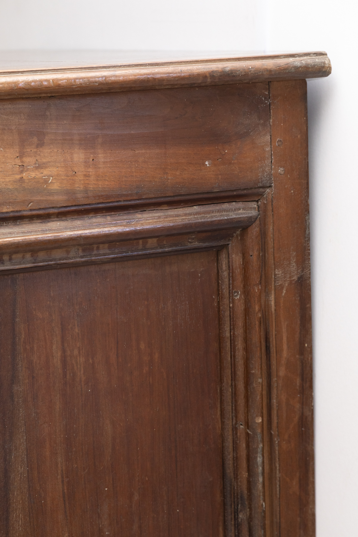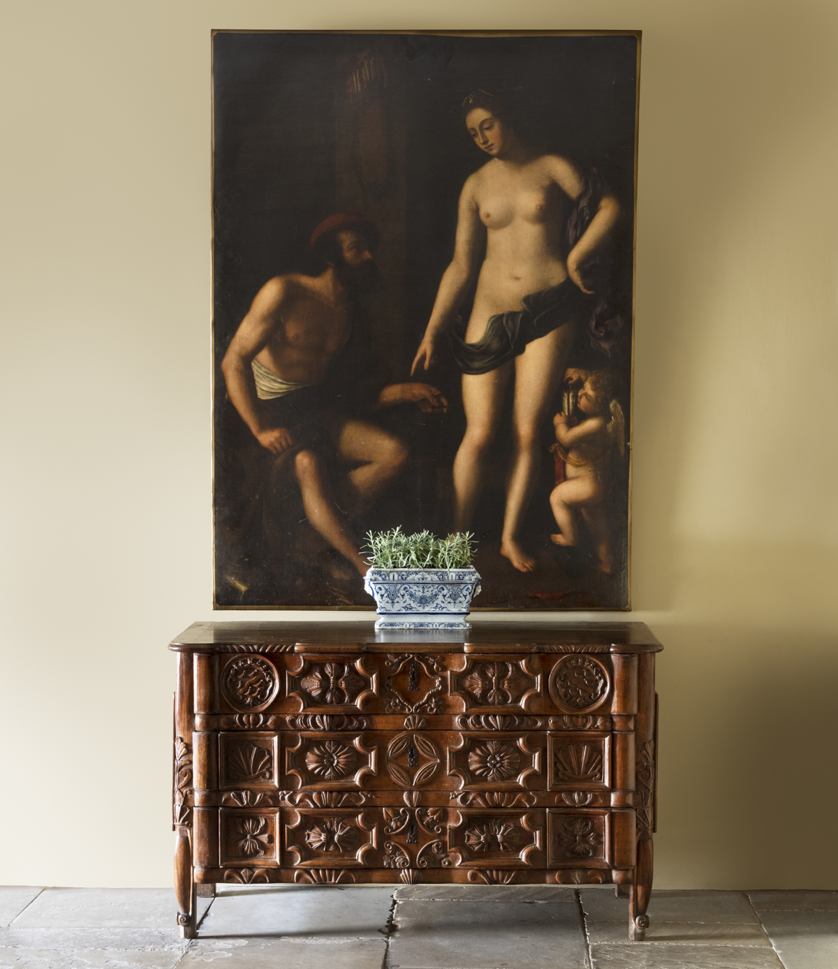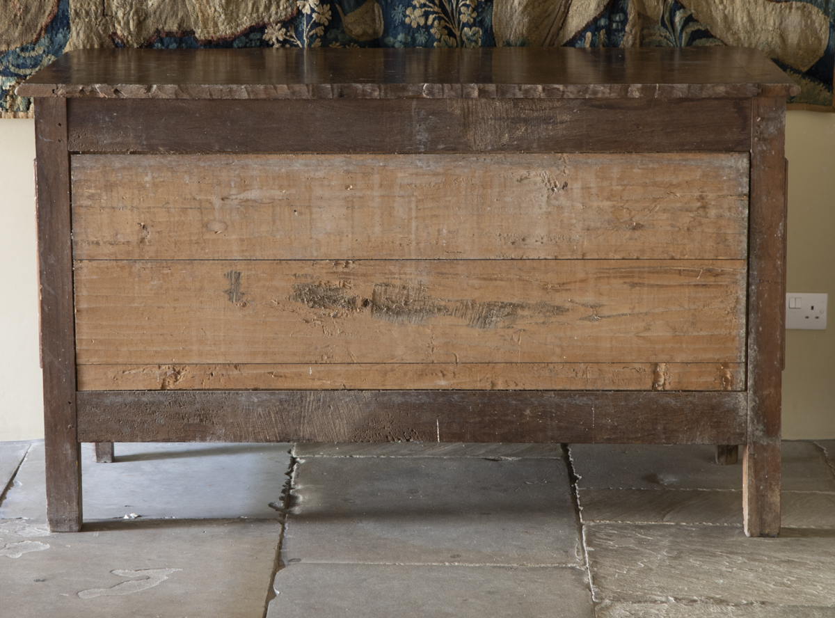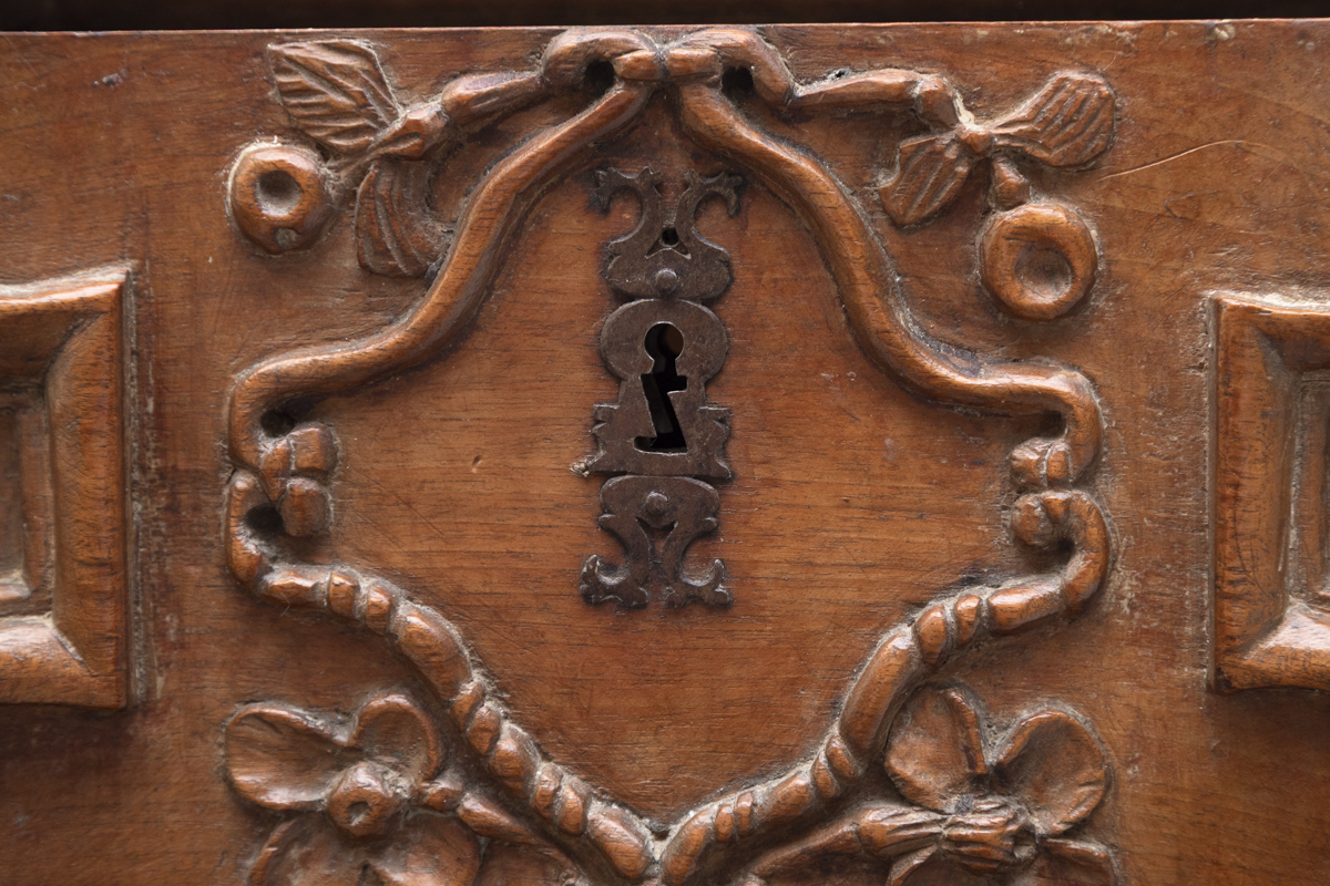 With three long drawers, each divided into five sections with various carvings in relief to include motifs of birds, hearts, flowers, fans, shells and more. The front legs with lighter carving terminating in scrolls, the back legs are square, the sides with a square carved frame. Shaped wooden top with a carved bullnose edge.