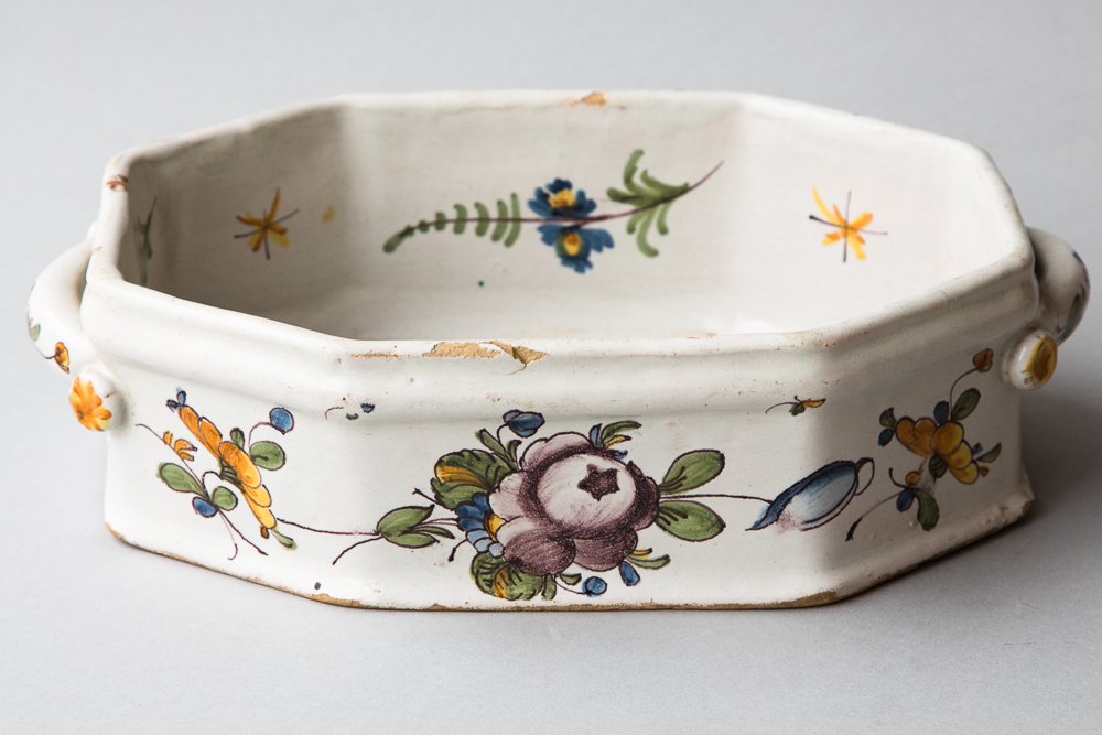 Decorated with floral designs and yellow stars, with a posey of flowers on the base of the inside.