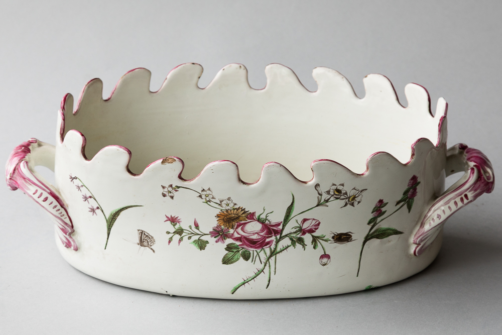 18TH CENTURY FAIENCE VERRIÈRE OR WINE GLASS COOLER Decorated in polychrome with garlands of flowers and insects with pink rococo handles and pink outline to the shaped edge.