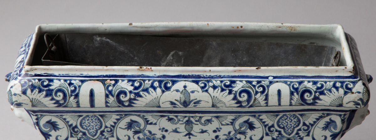 Faïence (tin-enameled earthenware) rectangular planter decorated with lambrequins, garlands and scrolling flowers in blue