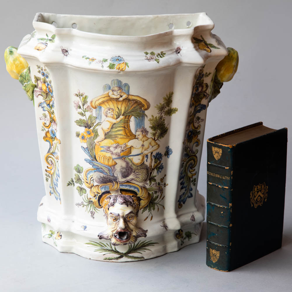 Decorated with mythological characters of the sea, Neptune with his trident and his sea horse surrounded by cherubs, flowers and scrolling rococo decoration. Two lemons on either side act as handles and there is a central mask of a satyr in relief for the original bronze tap.