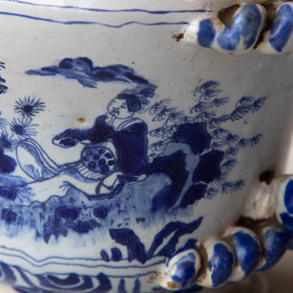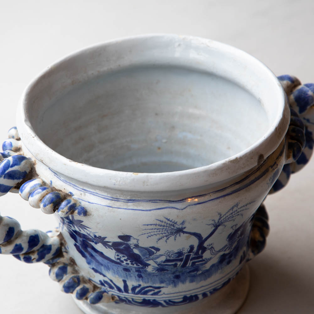 The circular tapered body with two twisted rope handles depicting a Chinese garden setting with figures, plants and trees painted in blue on a pale blue glazed white background. Three drilled holes in the base. France late 17th century, circa 1680.