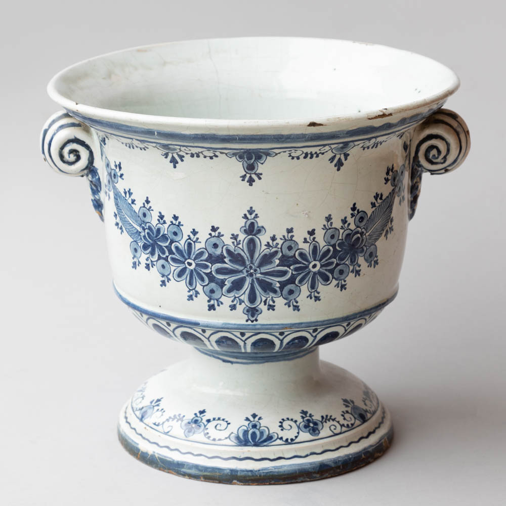 LATE 18TH CENTURY FAÏENCE CACHE POT ON A PIÉDOUCHE Blue and white glazed faïence large round cache pot decorated with flowers, lambrequins and scroll handles. Raised on a round socle base and drilled three times. Rouen , France, late 18th century.