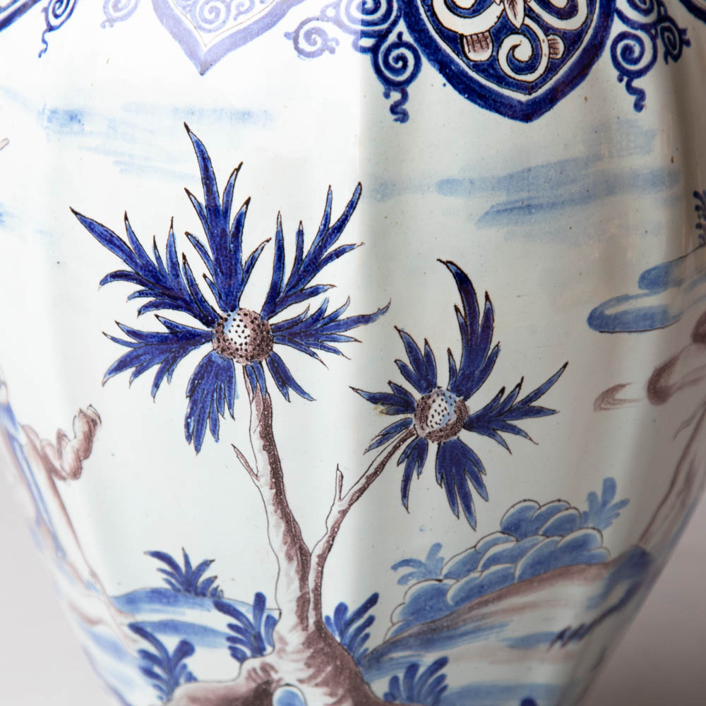 An 18th century octagonal faience lidded vases in blue, manganese and white. Decorated with hunting scenes to include a mounted rider fighting an elephant and a huntsman chasing a dear. With lambrequins around the neck and hounds on the lid.