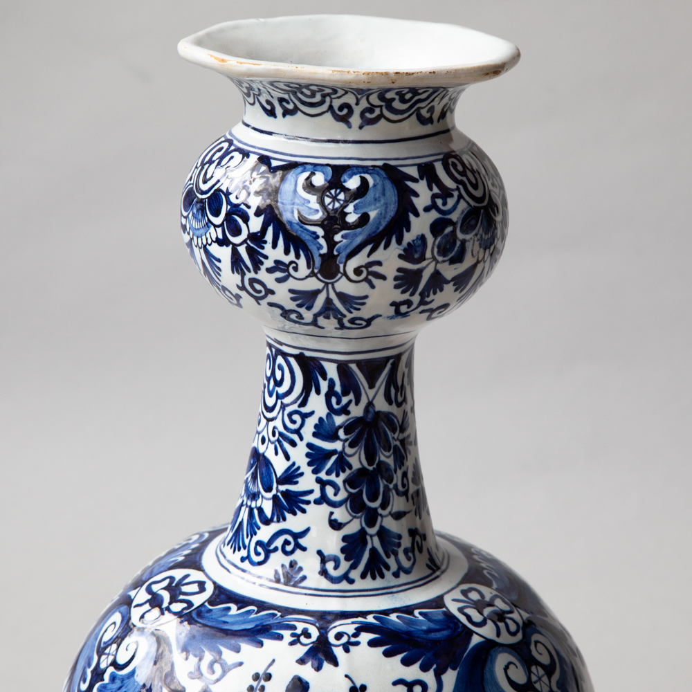 18TH CENTURY OCTAGONAL DUTCH DELFT BLUE AND WHITE WAISTED BOTTLE VASE With baskets of flowers and further floral and geometric decoration. Signed on the base from De Porceleyne Clauw factory The Netherlands, late 18th/ early 19th century.