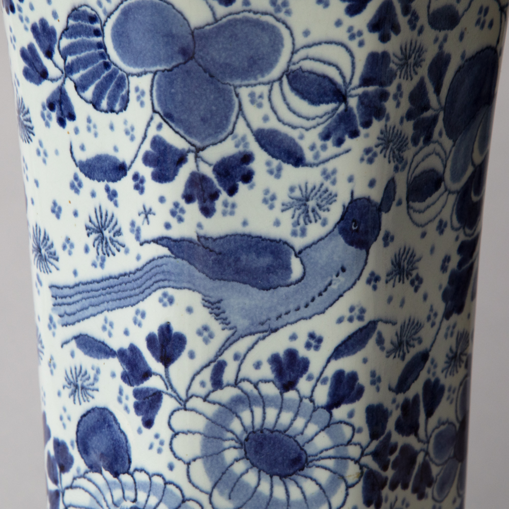 A LARGE DUTCH DELFT OCTAGONAL BLUE AND WHITE BEAKER VASE The body painted in camaïeu bleu with chinoiserie scenes of birds, flowers and shrubs. Stamped on the base. The Netherlands, 19th century. HEIGHT: 42.5 cm (16¾") DIAMETER: 19.5 cm (7¾")