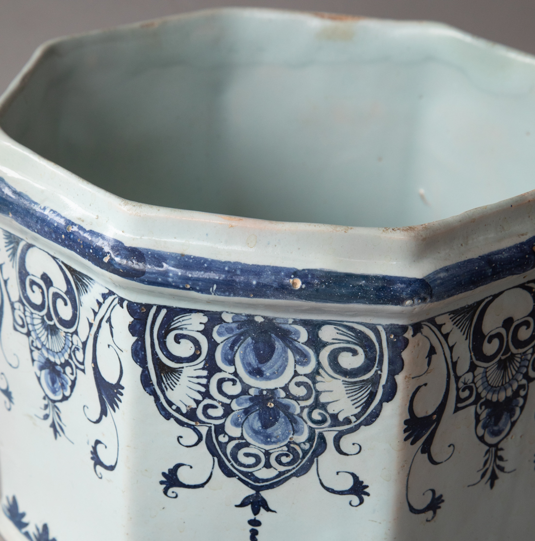 Faïence (tin-glazed earthenware) decorated with blue lambrequins on a milky-white background.