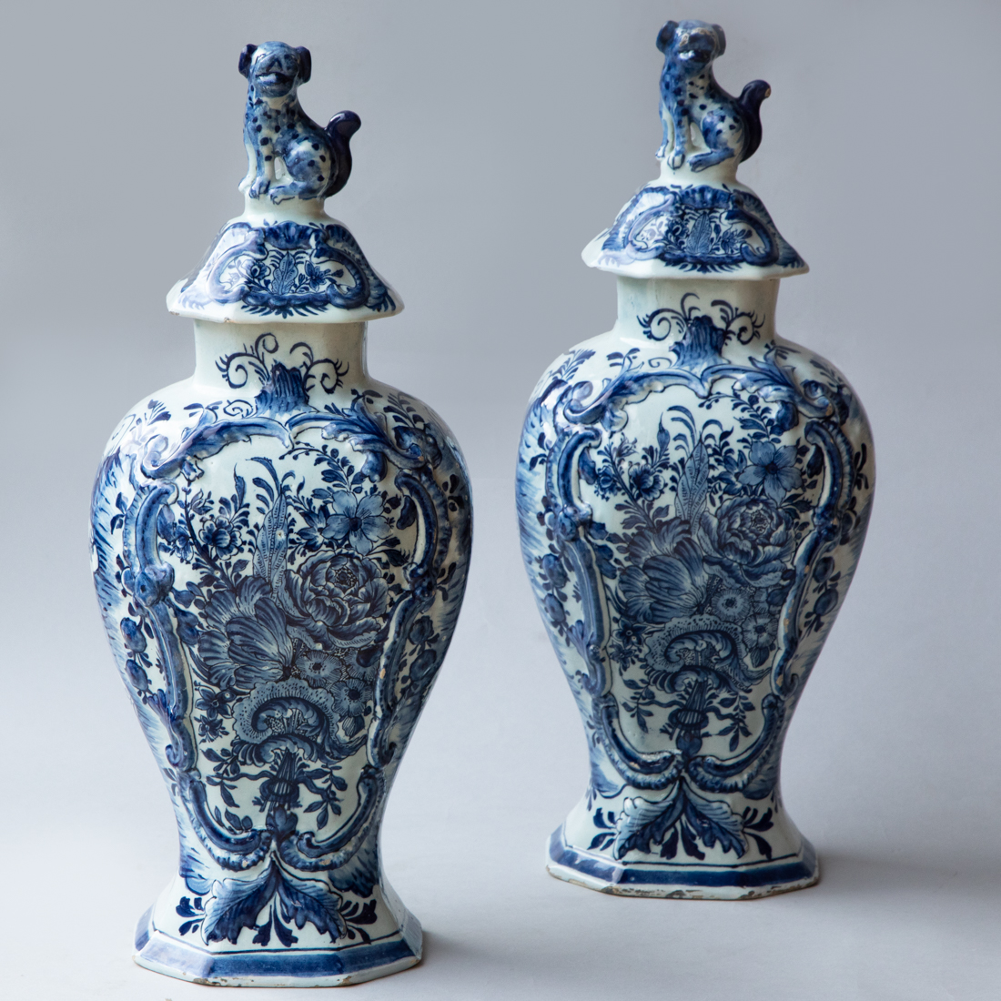 Blue and white tin-glazed and enamelled earthenware vases with covers, decorated in cobalt blue with flowers and leaves on a milky white ground surrounded within a cartouche outlined with rococo detail in relief.