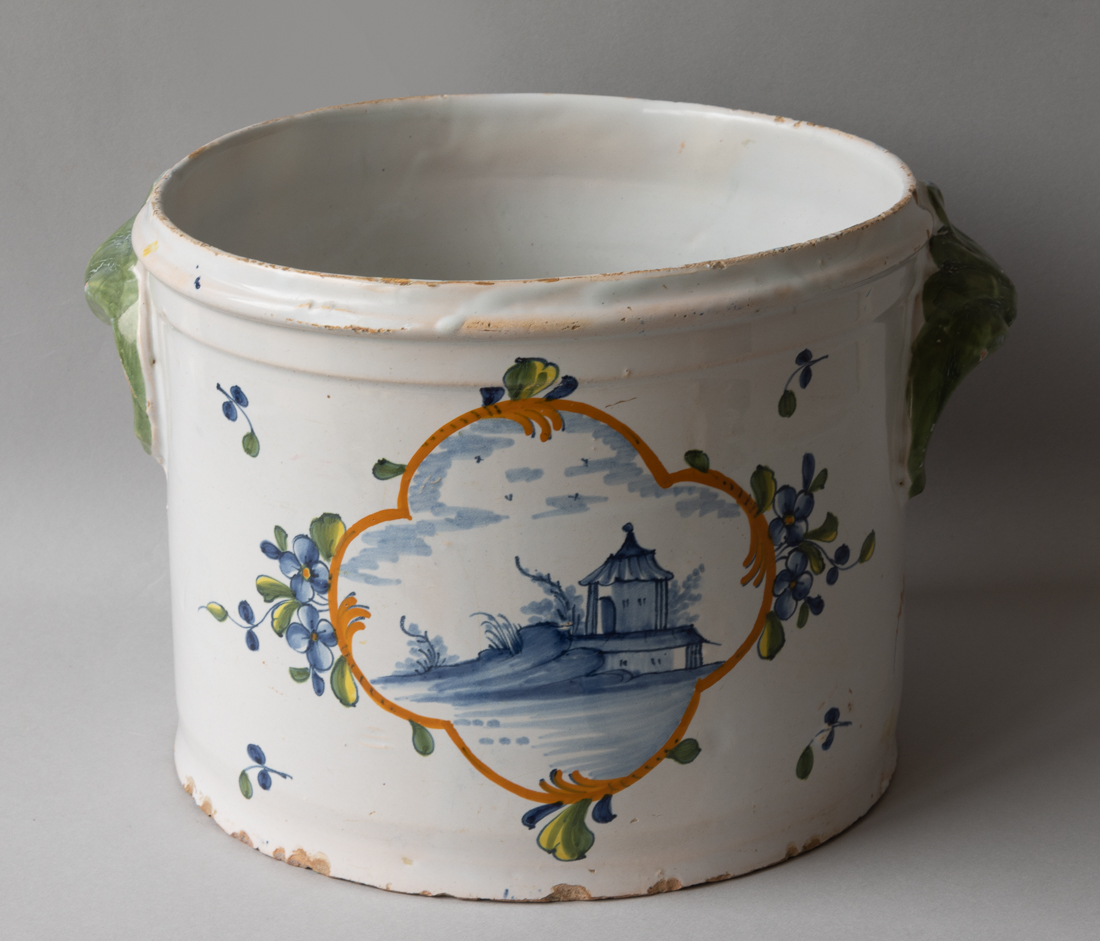 Handles in the shape of leaves or shells in green on either side the bosy with sprigs of flowers on a milky white ground.