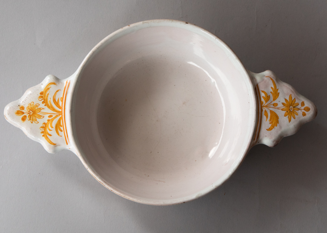 The round bowl decorated in yellow with flowers, figures and birds.