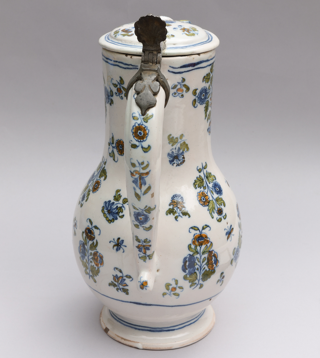 The body of the jug decorated with flowers in blue, yellow and green, the lid with original pewter decorative hinge.