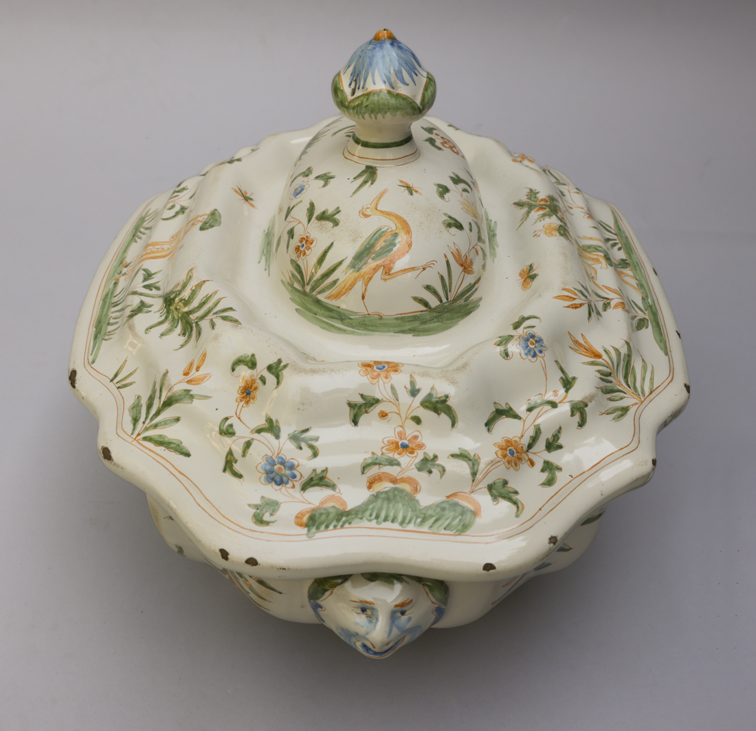 The shaped tureen decorated in green, yellow amd orange on a white ground with