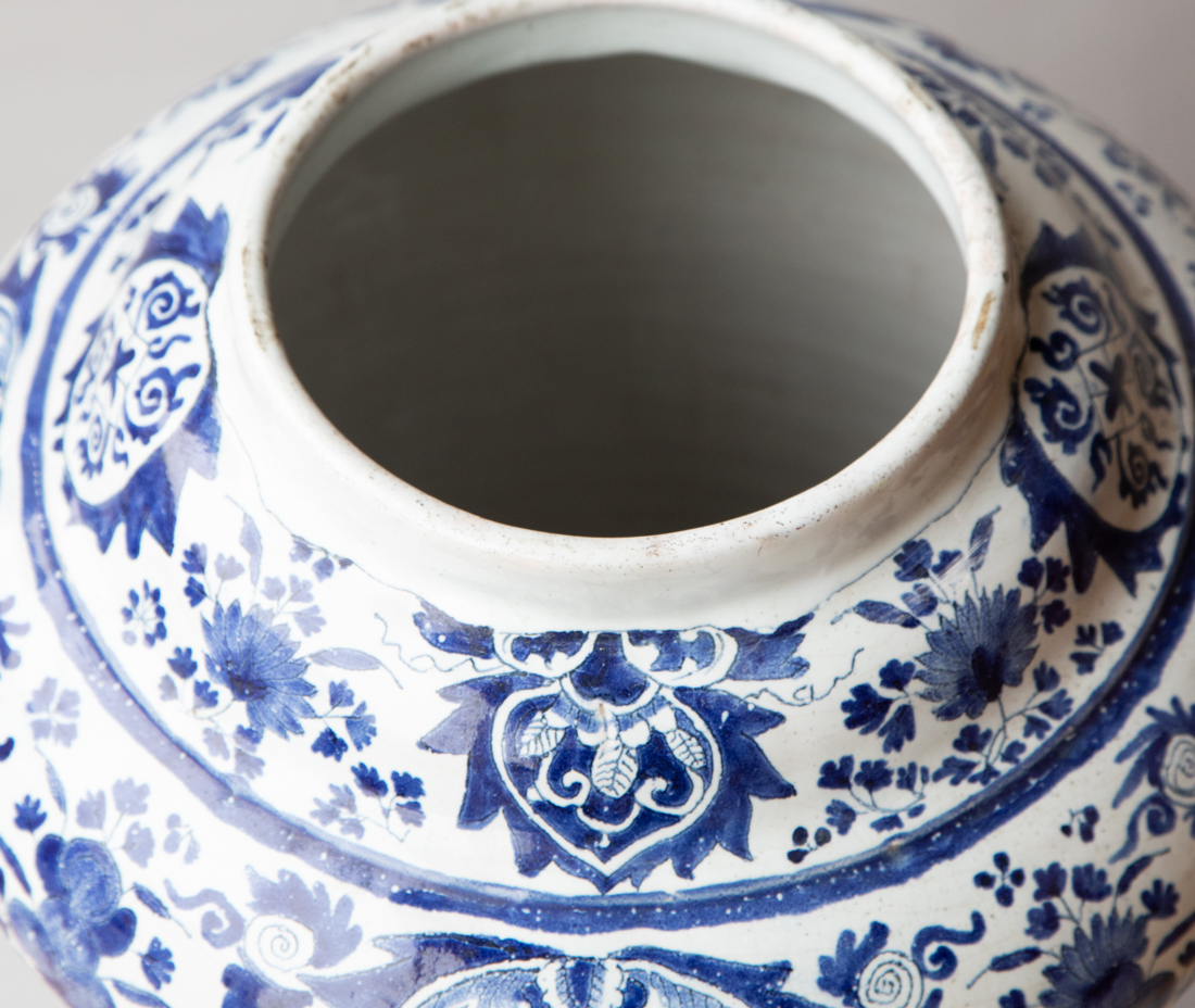 Large faience baluster fountain with female mask handles on either side. In the centre, a spotted Fleur-de-Lys in relief holds a bronze plug where the original tap would have been. The whole decorated in camaïeu bleu (cobalt blue) on a white ground, with feathers in relief, flowers and lambrequins. The fountain rests on a raised circular socle or piédouche.