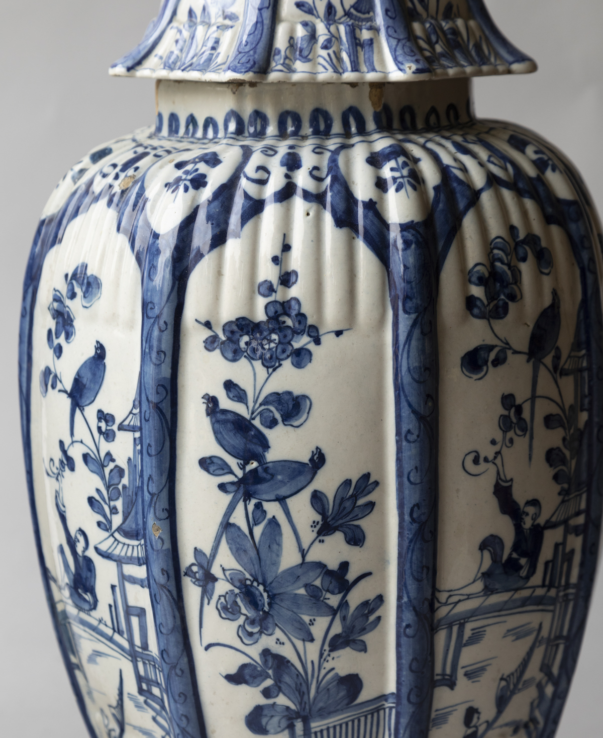 A pair 18th century glazed earthenware lidded vases in cobalt blue on a white ground. Each of the eight sides decorated with chinoiserie scenes within a cartouche; an exotic bird seated on a branch with flowers alternating with a figure seated on a bridge with another figure rowing a boat below and a bird overhead. The base and the neck of the vases gadrooned. The lids with flower decoration and lion finials.