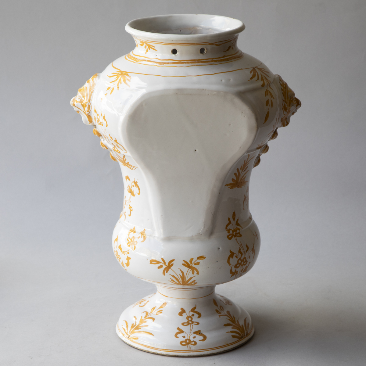 Faience baluster fountain in yellow ochre on a white ground with mask handles on either side. In the centre, a wide mask in relief holds a bronze tap. The whole decorated with fantastical figures, grotesques, animals and flowers.