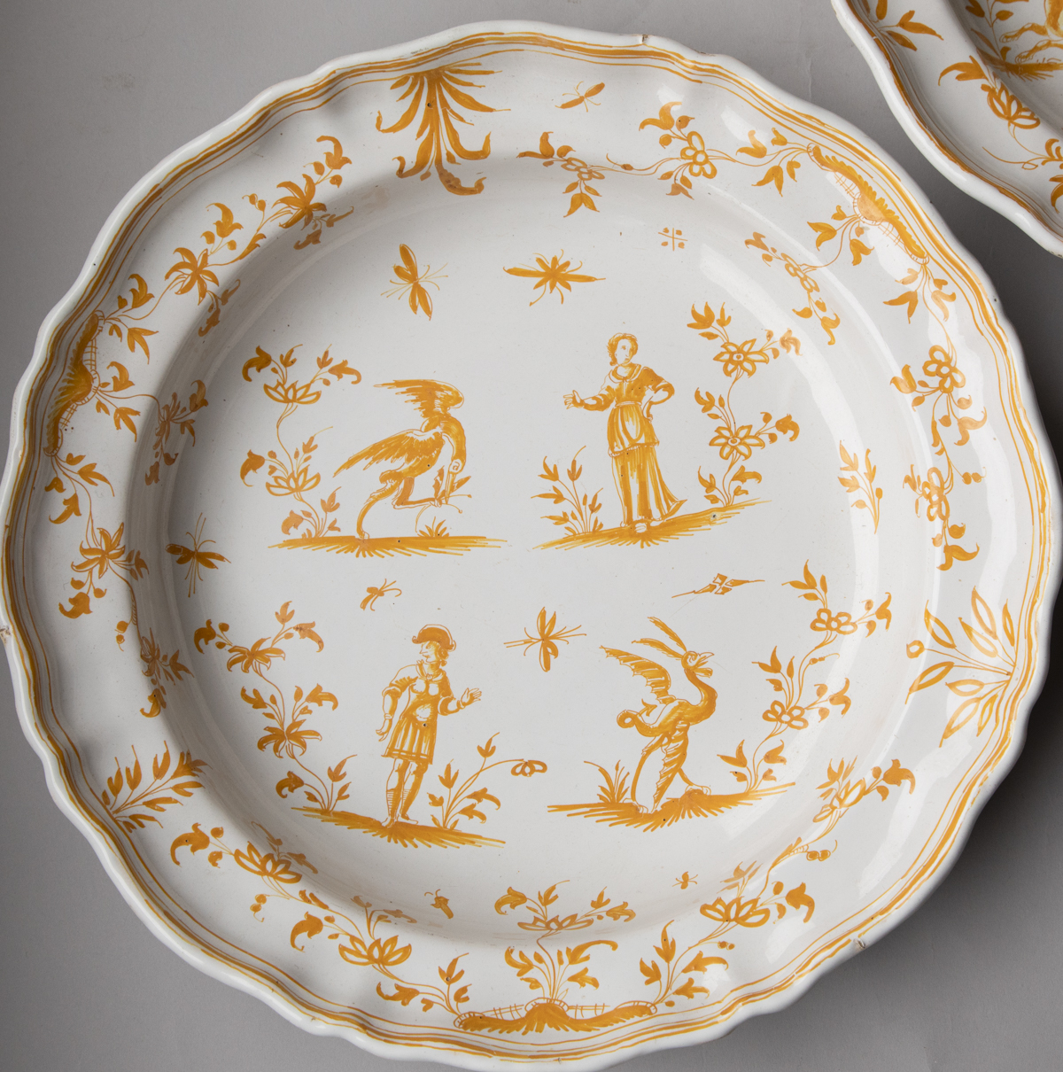 Painted in yellow on a white ground with scenes inspired by the Commedia dell'Arte depicting mythical beasts and theatrical caricatures. Plants and flowers surround them and the whole encircled by yellow lines around the edge.