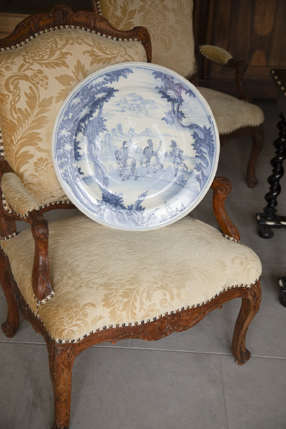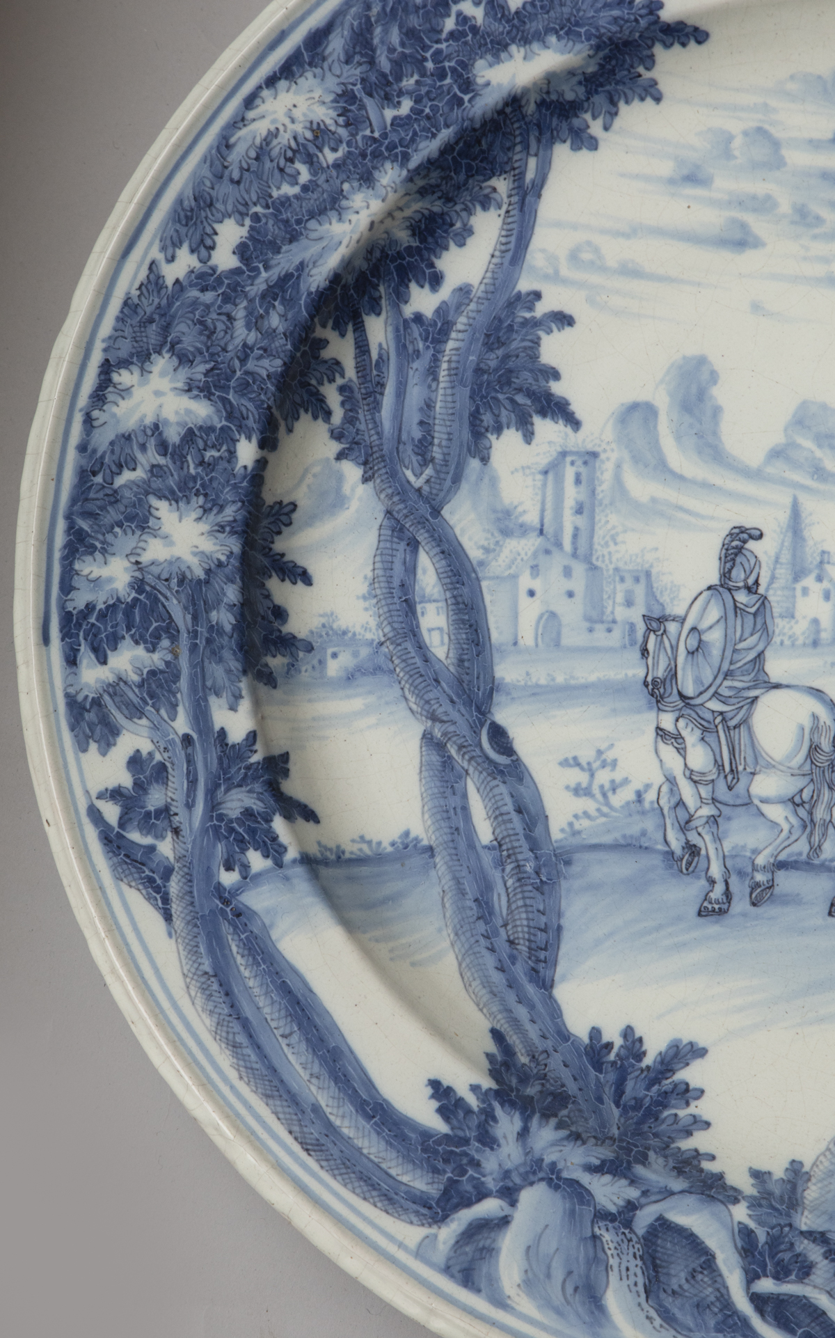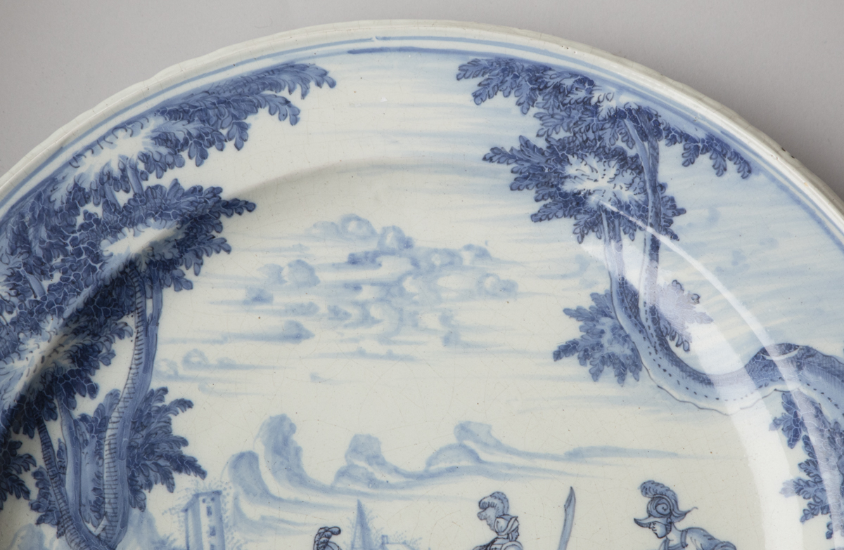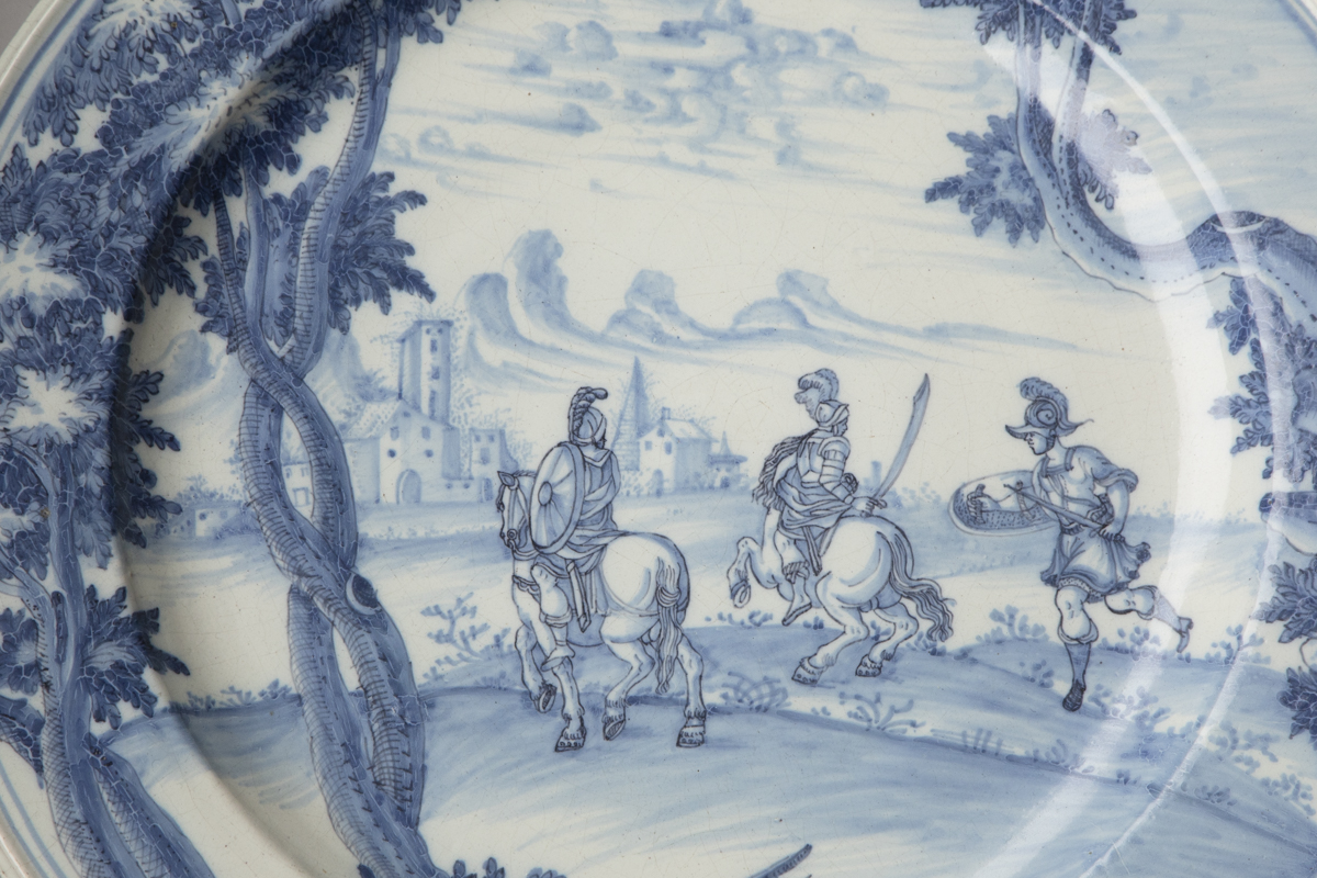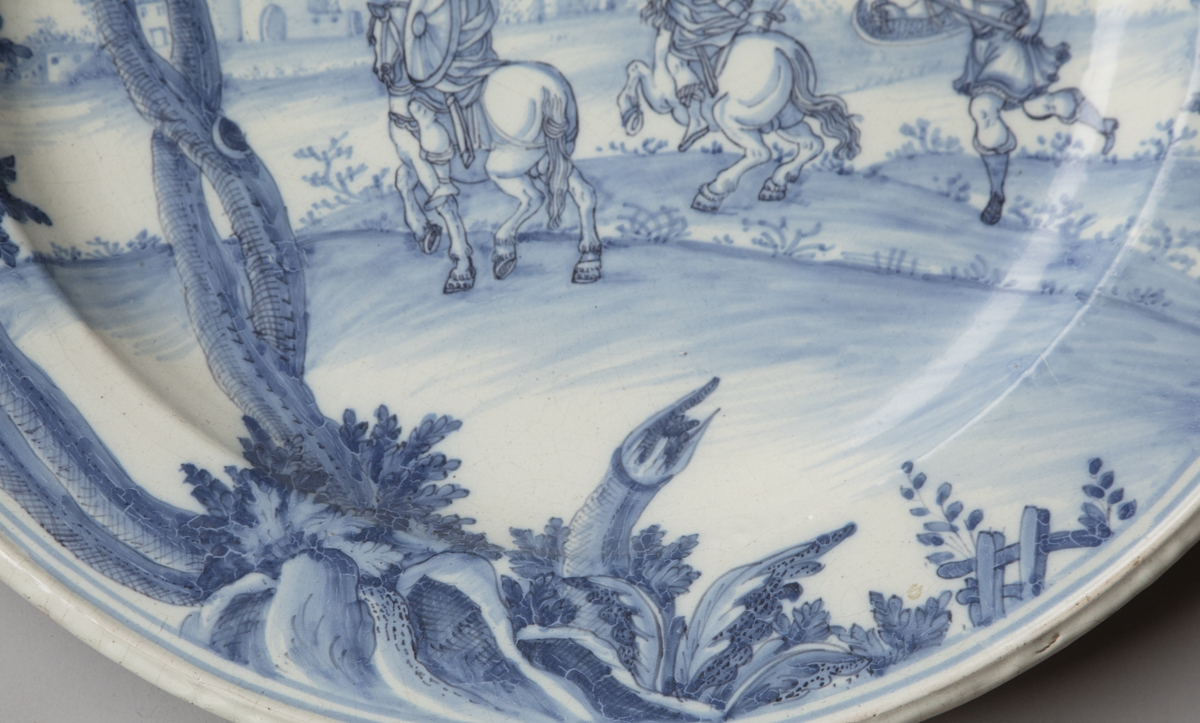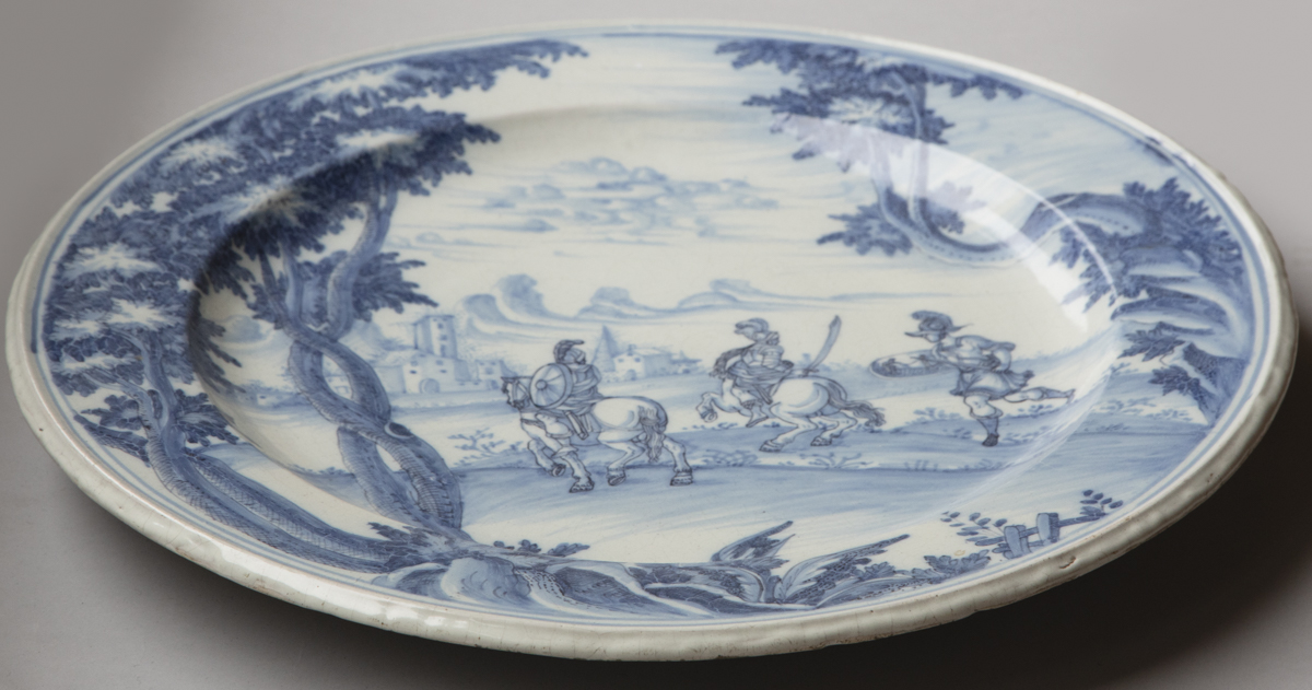 Painted in cobalt blue on a white ground, with a landscape image depicting three soldier, two of whom are on horseback in Roman costume with swords and shields approaching a village in the distance and with trees in the foreground.