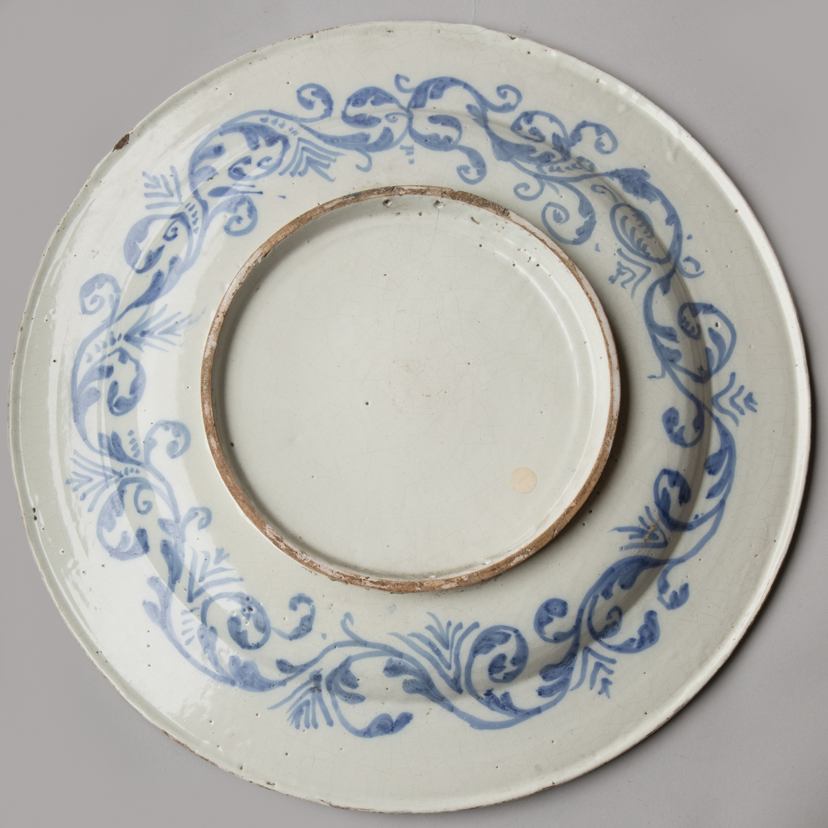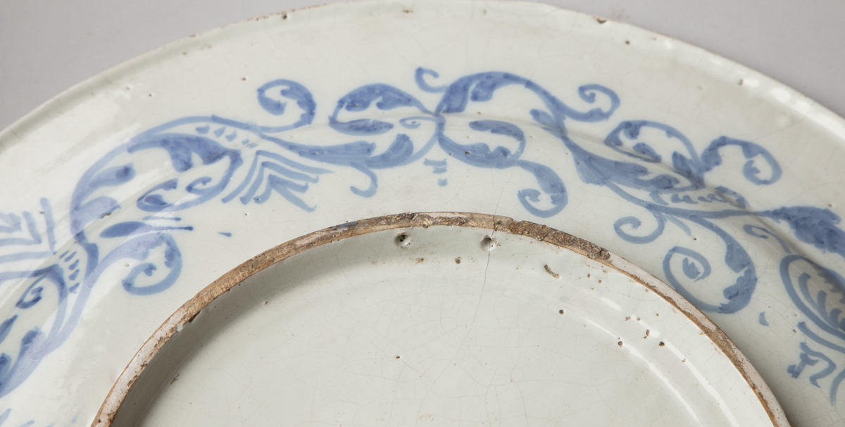 Blue trim around the edge with the reverse side decorated with a wide frieze of floral arabesques.