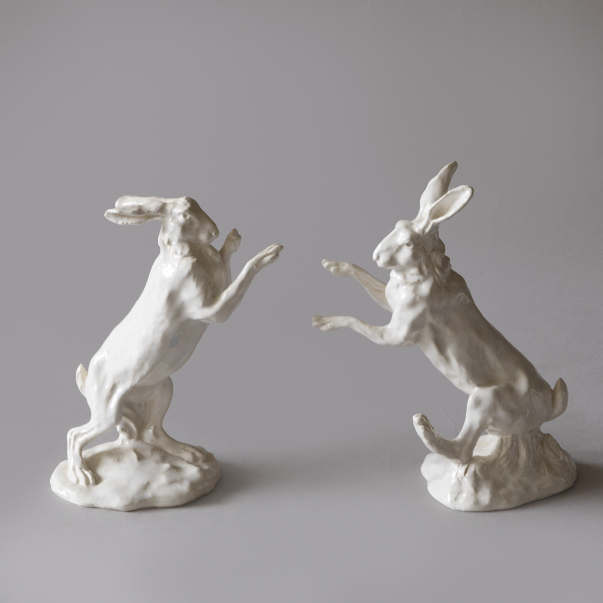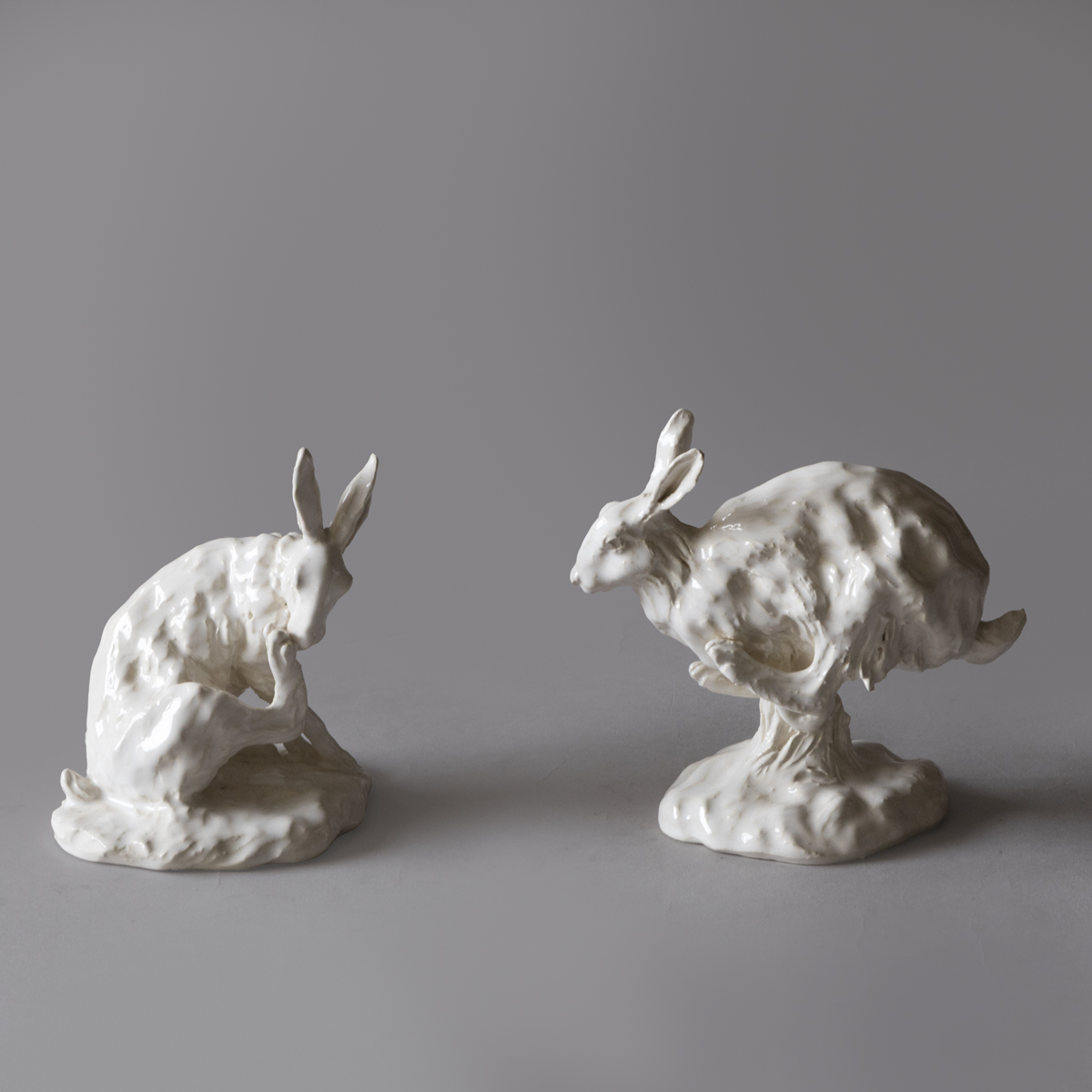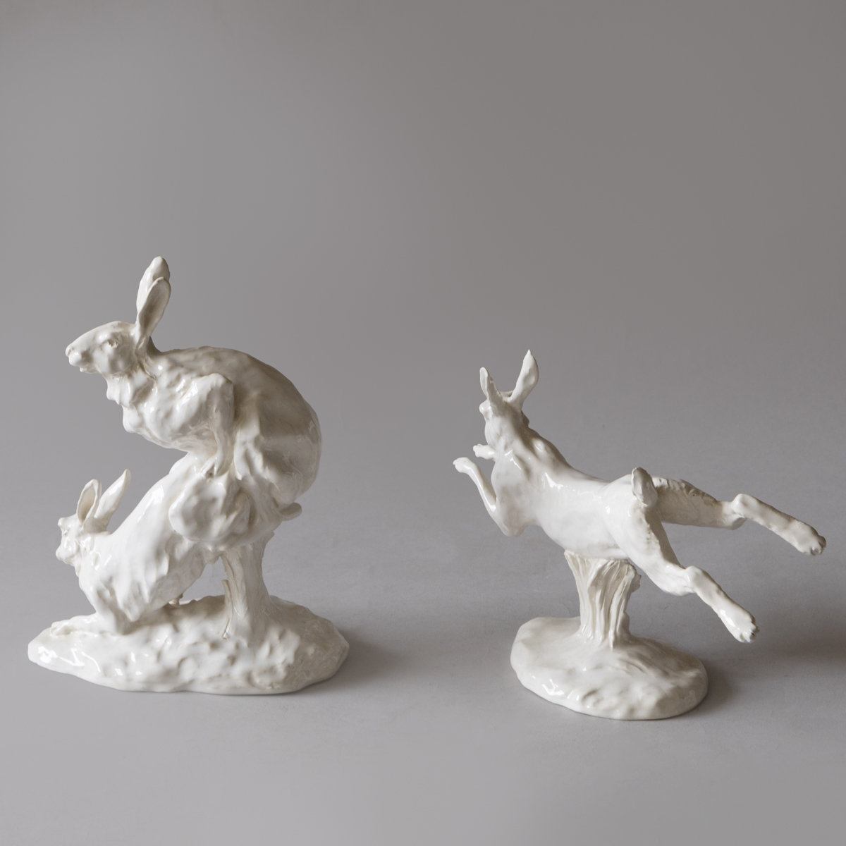 A collection of fifteen sculptures depicting hares in various lifelike positions; standing, sleeping, boxing etc.