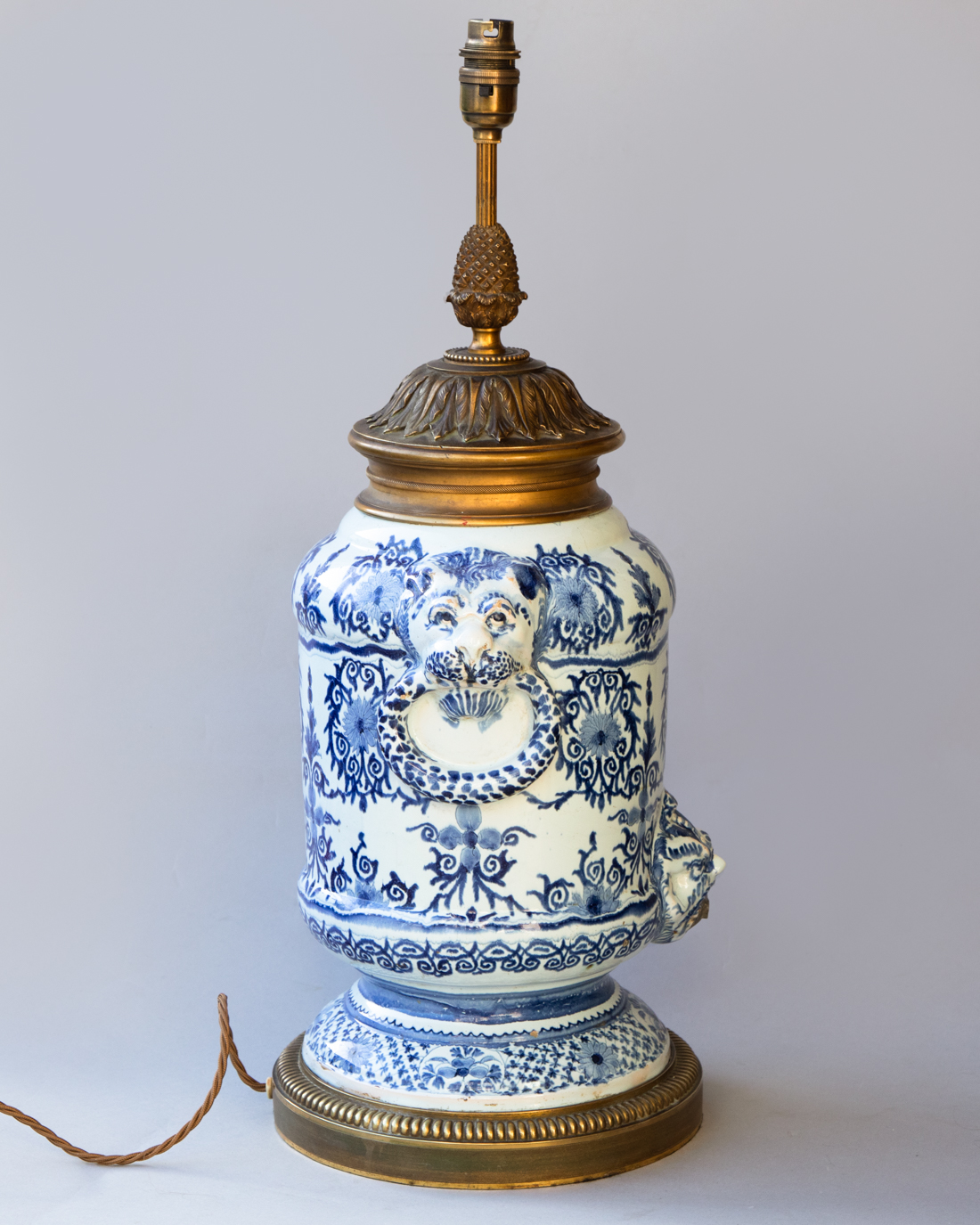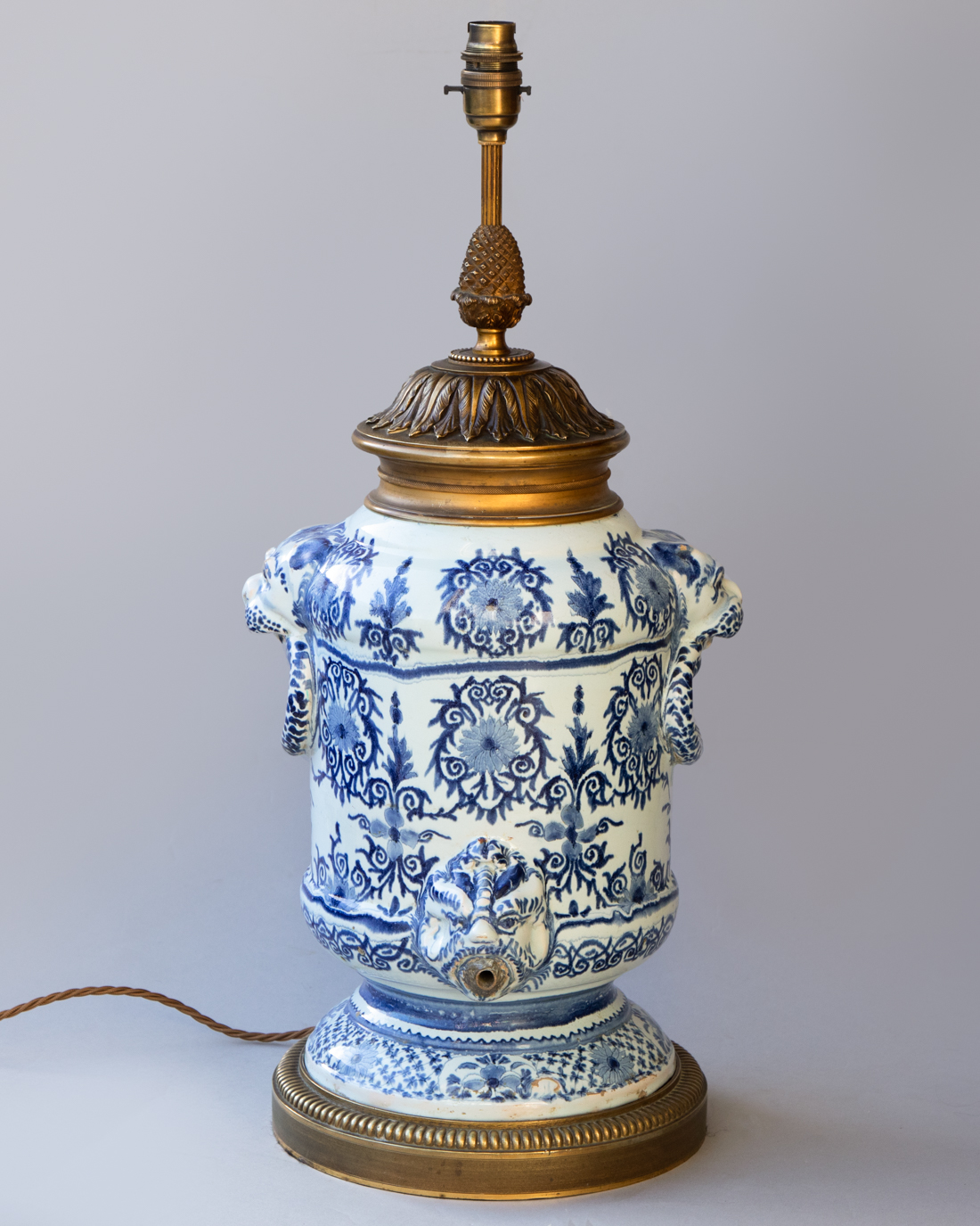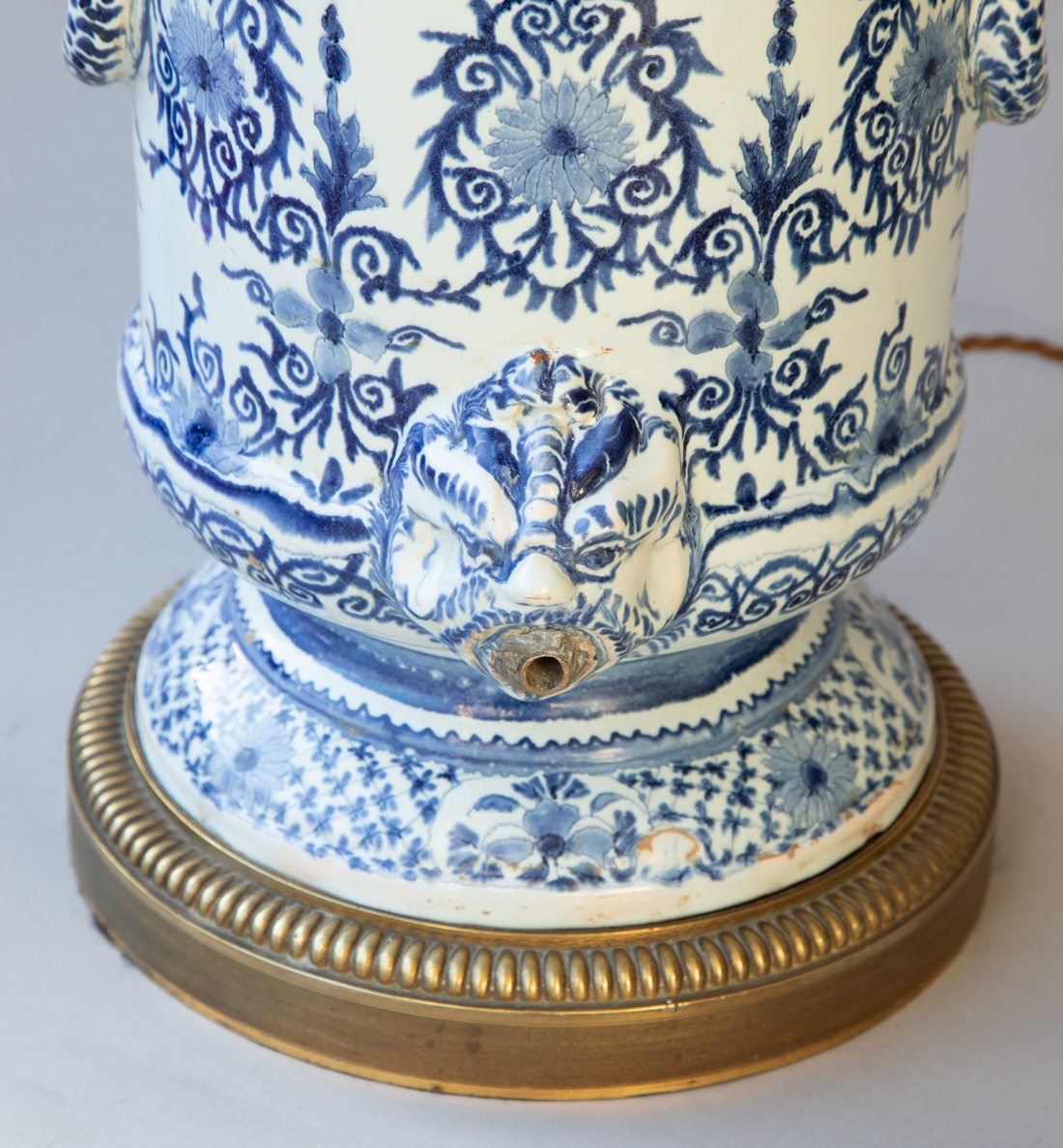 Faience baluster fountain raised on a pied douche with mask handles in the form of lion's heads holding rings.