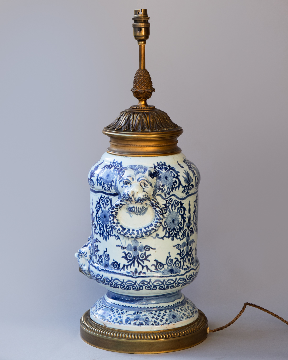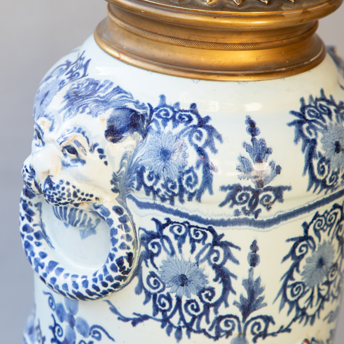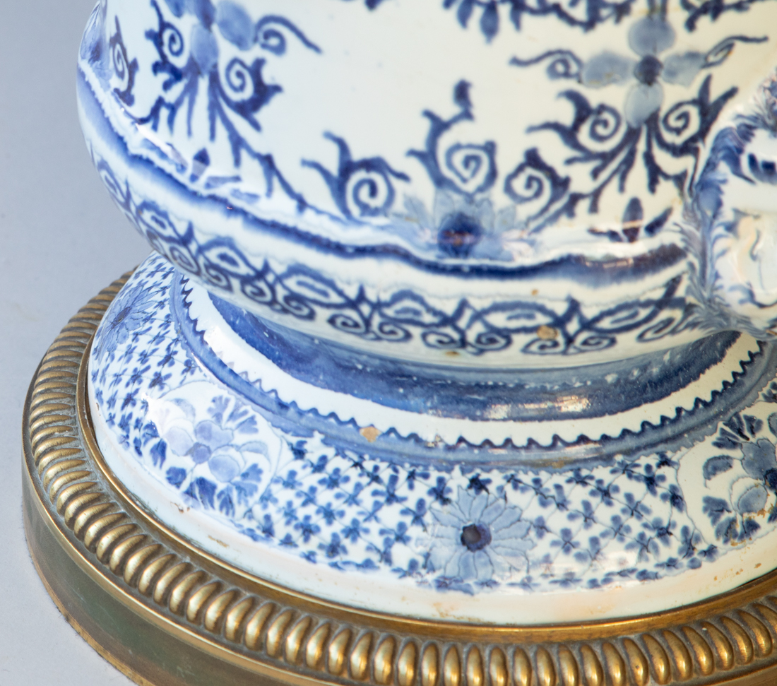 Faience baluster fountain raised on a pied douche with mask handles in the form of lion's heads holding rings.