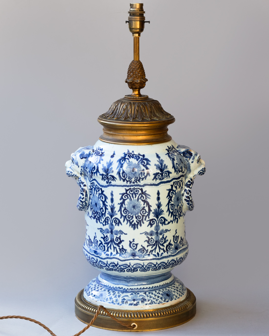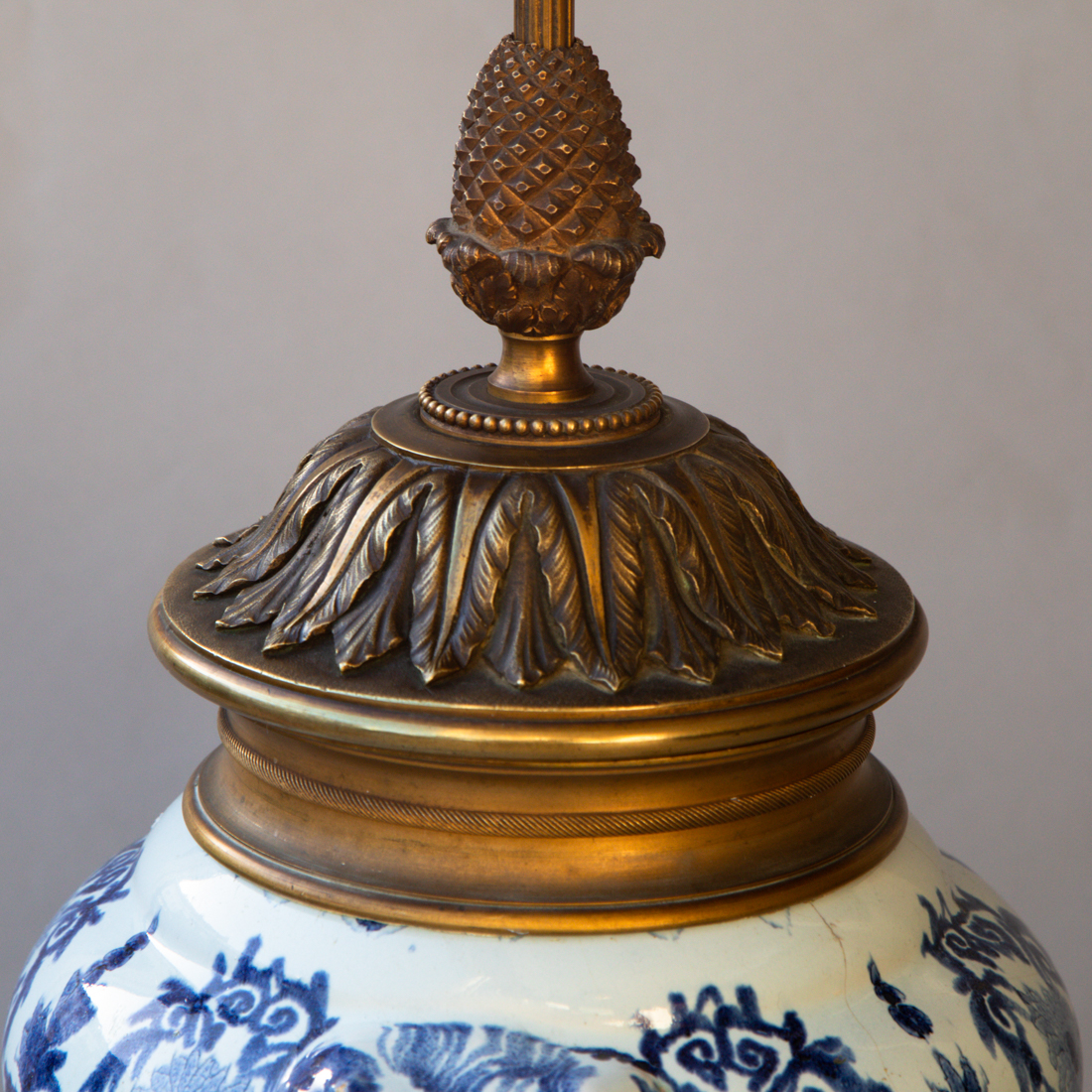 With 19th century gilt bronze mounts; a ring at the base and a decorative acorn finial with leaf and berry decoration to the top. Shown with 20" gathered silk shade available separately.