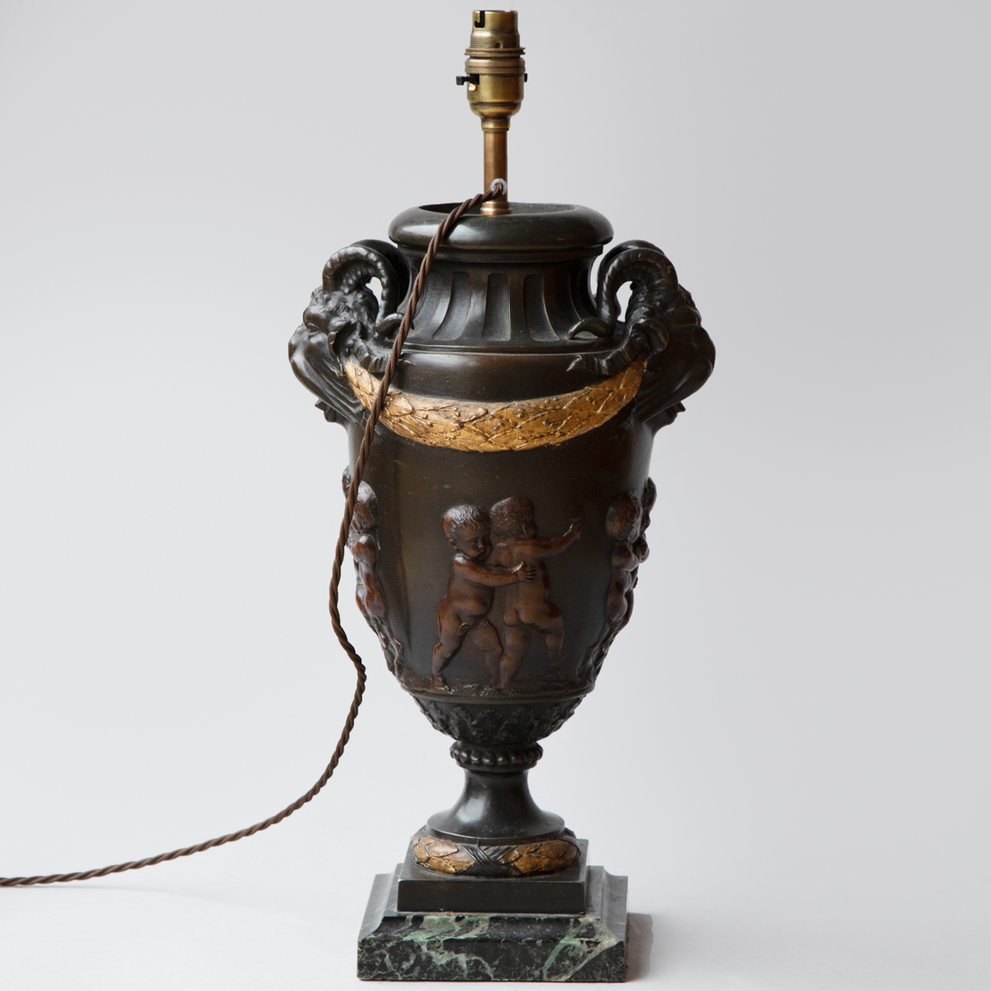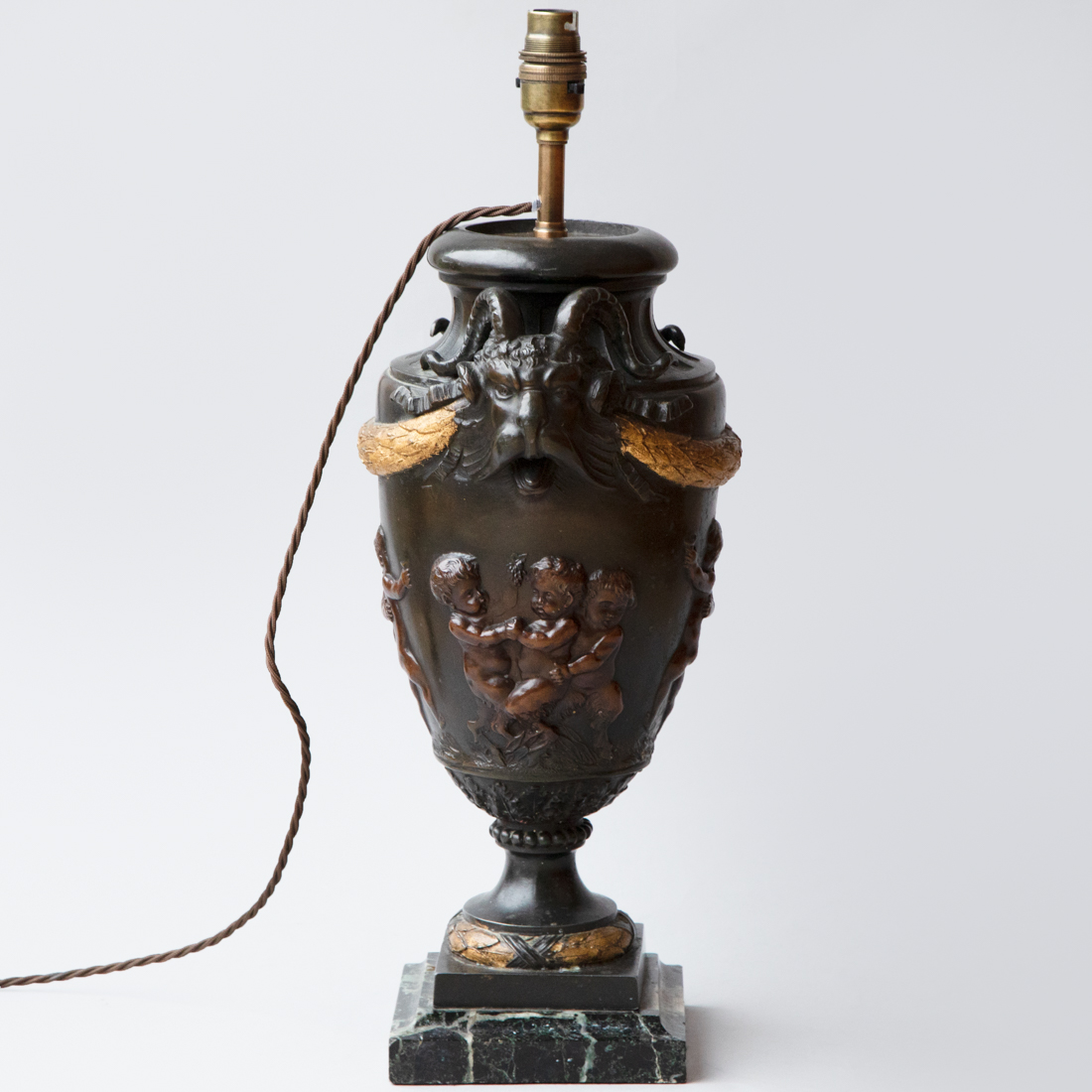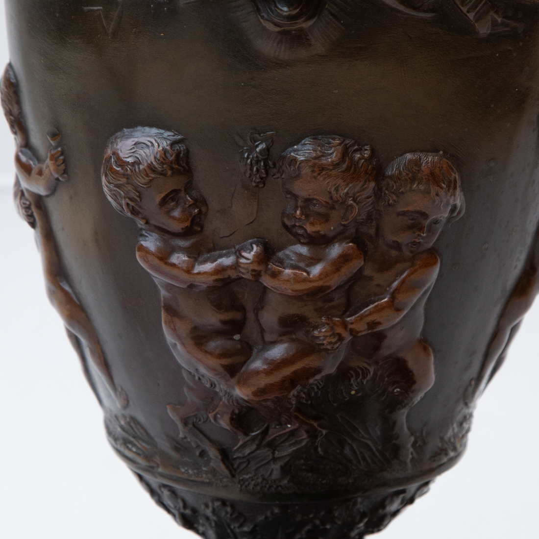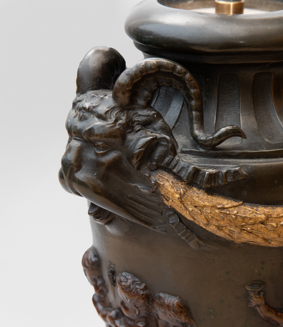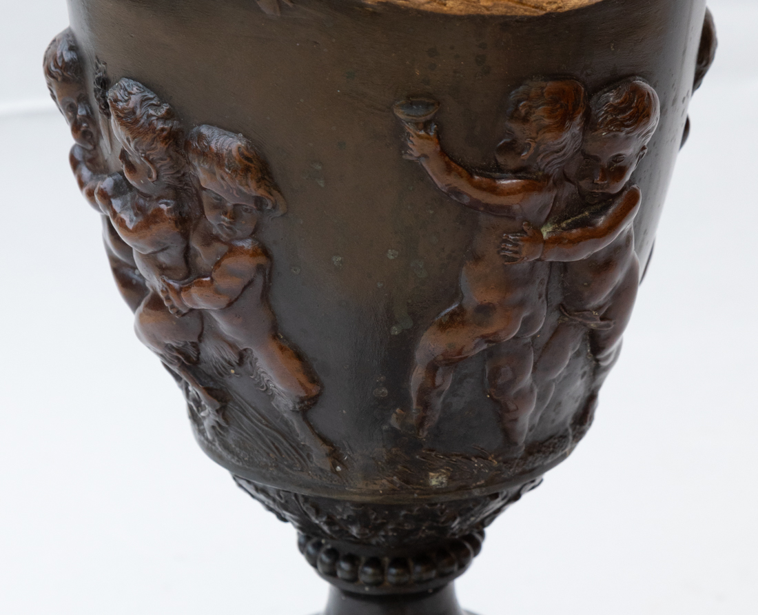 Decoration around the central body with putti in relief. Mask handles in the form of rams heads.