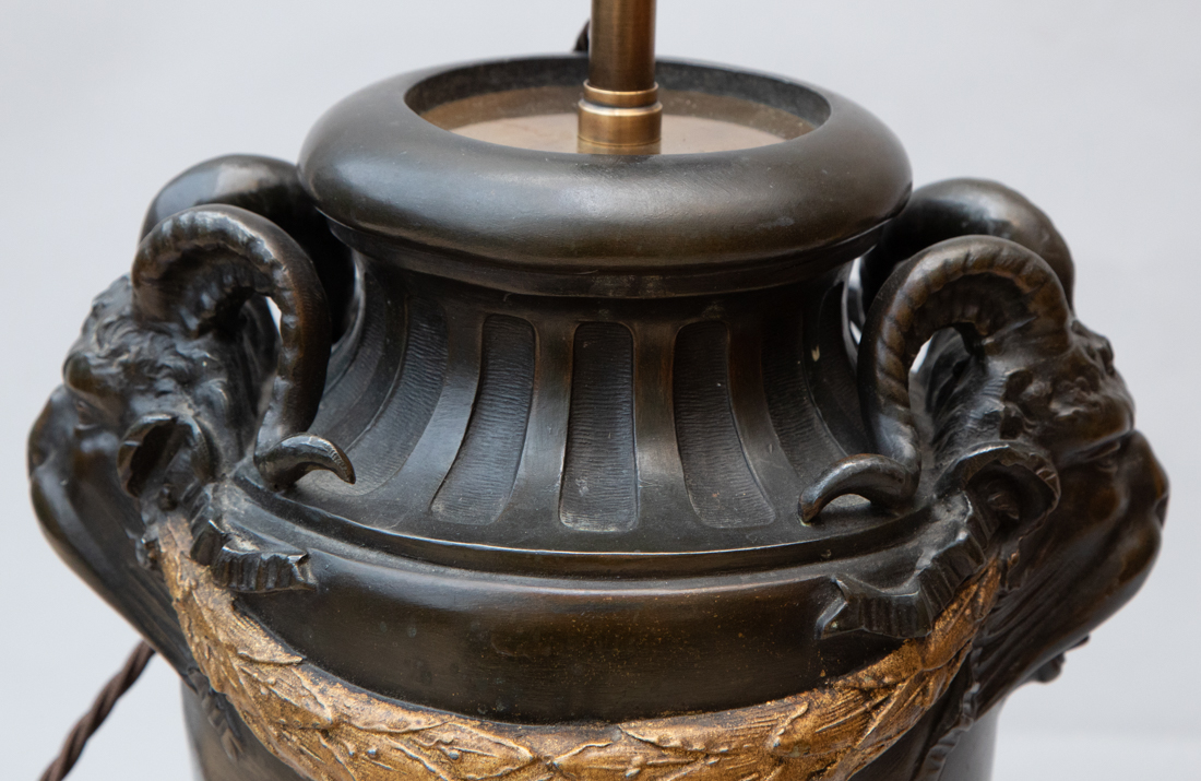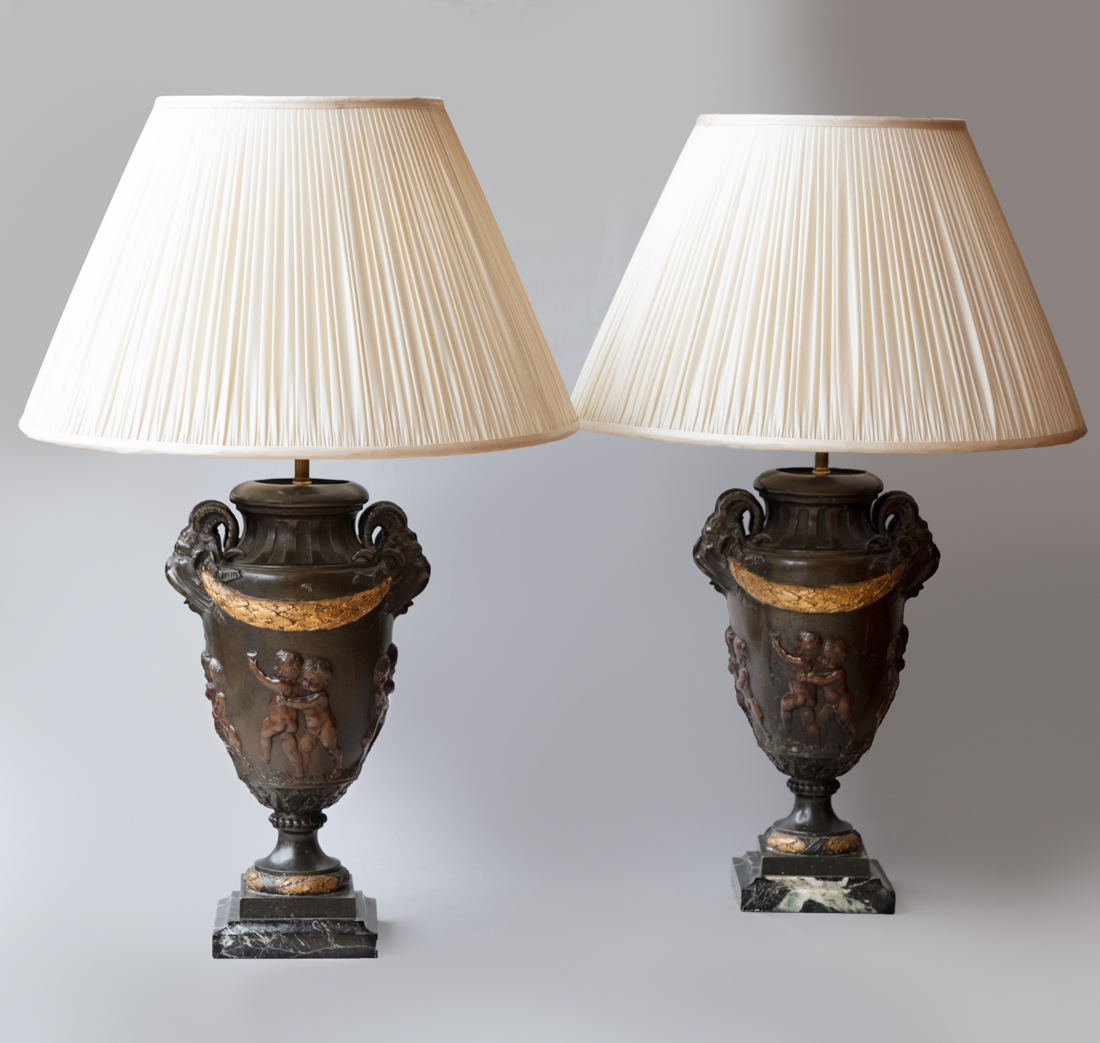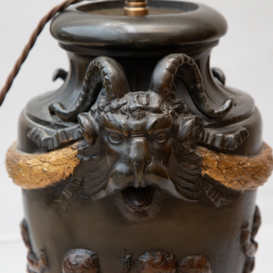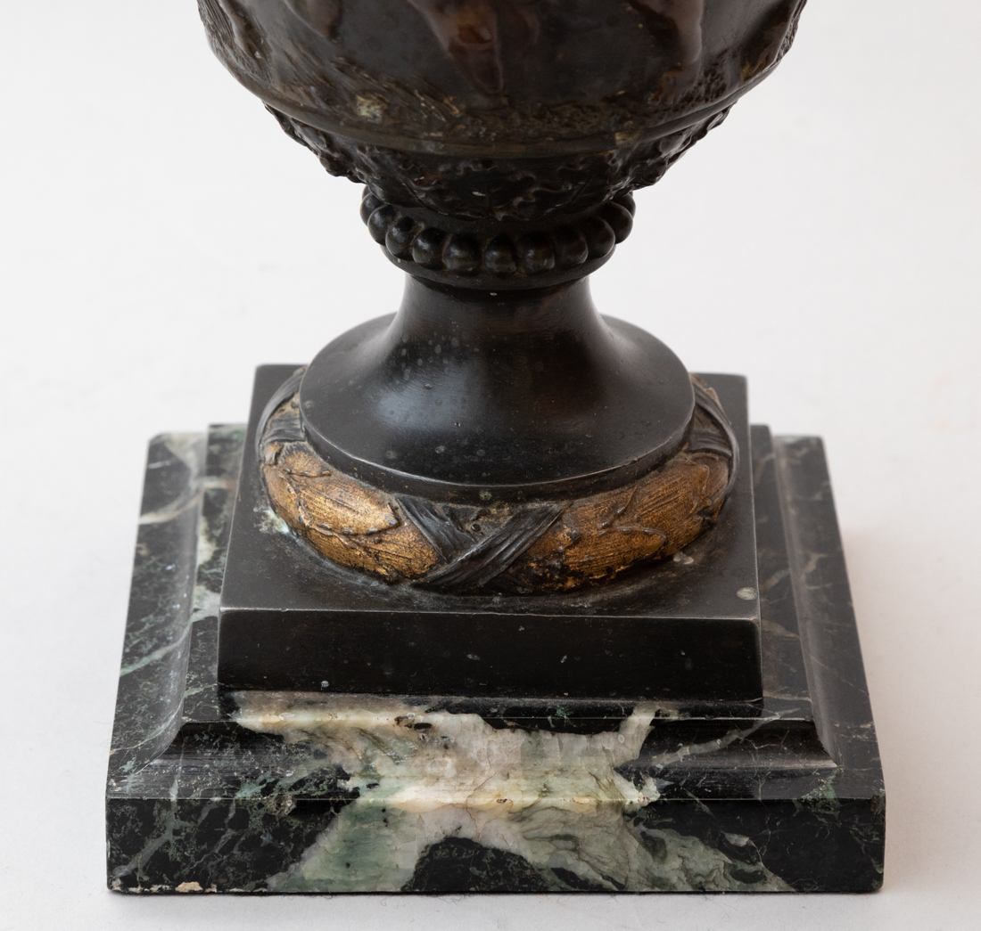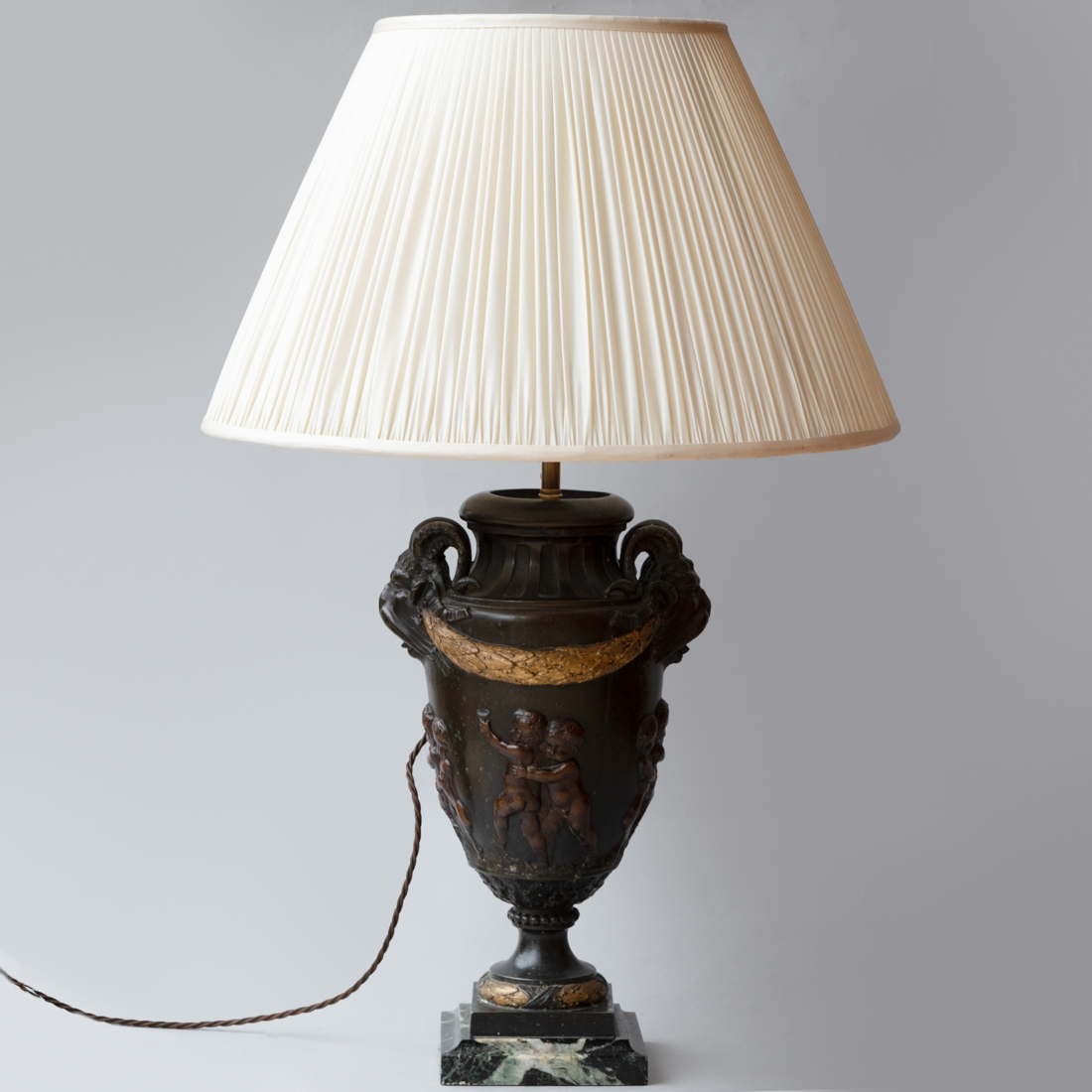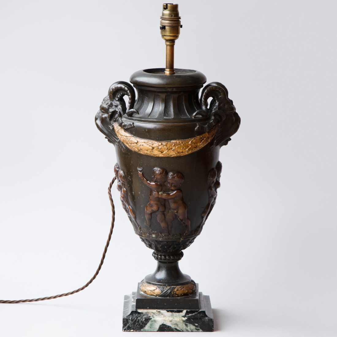 Decoration around the central body with putti in relief. Mask handles in the form of rams heads.