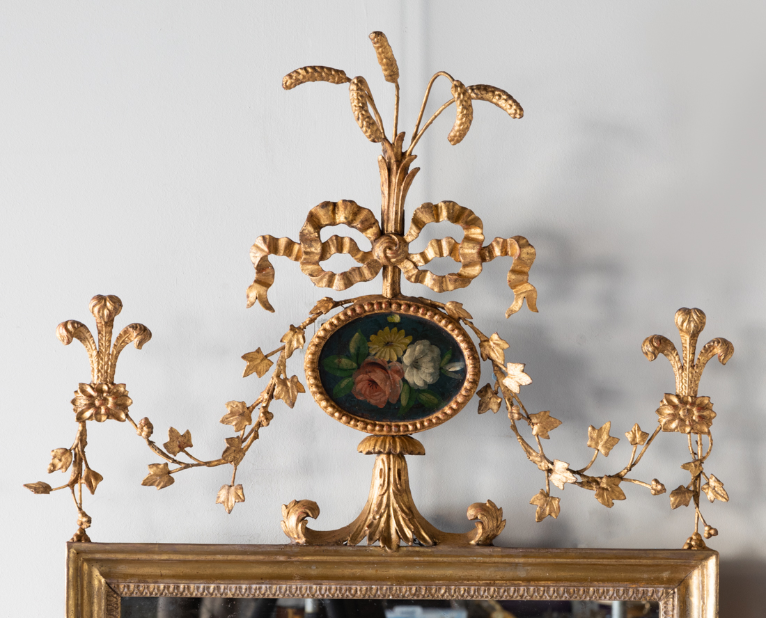 LATE 18TH CENTURY The rectangular plates with leaf and berry frames surmounted by a central small oval still life painting of three flowers, crowned by a ribboned bow holding a sheaf of corn. Surrounding this a finely carved garland of ivy which supports a rosette and plume of ostrich feathers at the corner of both the top right and left hand corners of the mirror.
