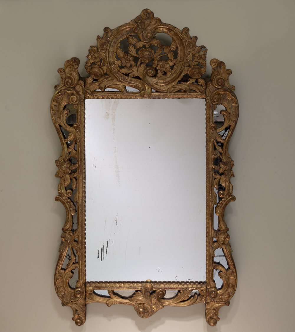 openwork pediment surmounted with a shell flowers and leaves. Original mercury glass.