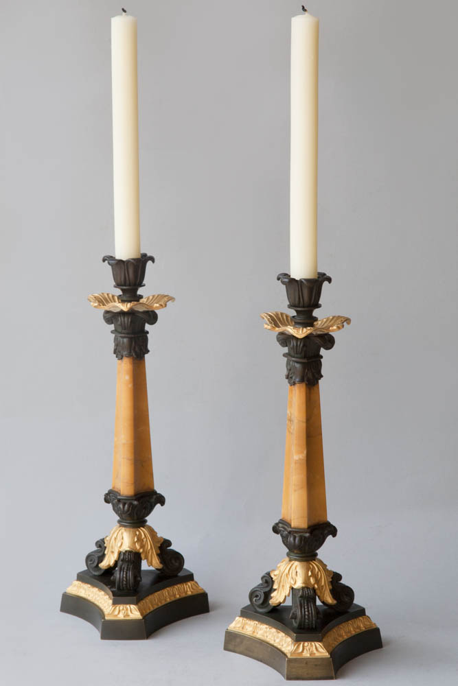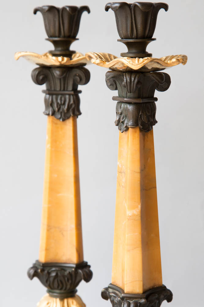 Pair of early 19th century candlesticks, the central pyramid column in Sienna marble, with patinated bronze Corinthian capitol and gilt bronze leaf decoration.