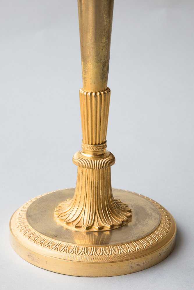 Pair of early 19th century finely incised gilt bronze candlesticks retaining their original mercury gilding, with downward tapering columns terminating with