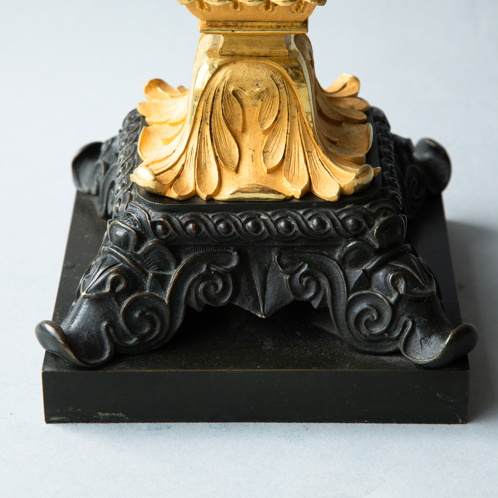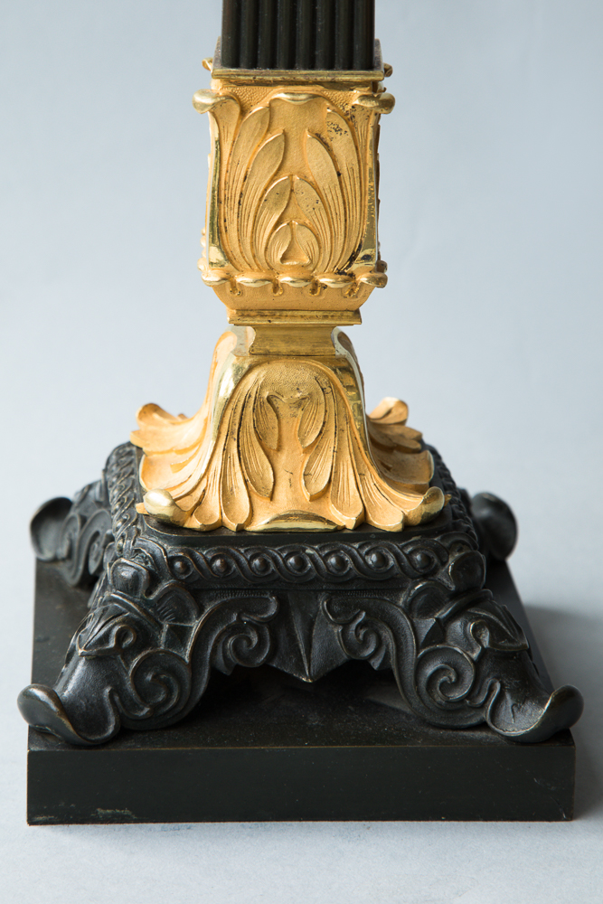 With four arms constructed in a square and one central patinated arm holding the candles, mounted on a reeded patinated square column, supported by gilt acanthus leaves all atop of a square plinth base decorated with foliate designs. France c. 1840.