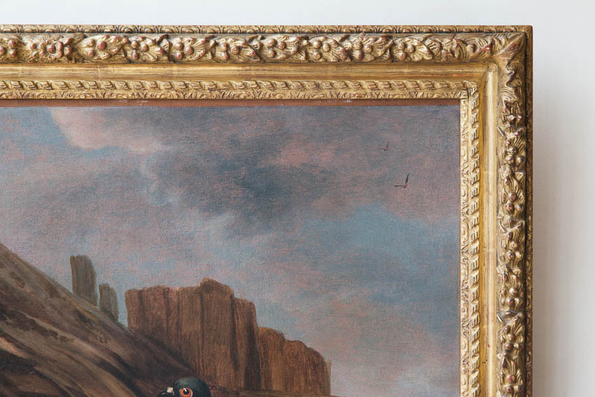 In the foreground pigeons on a roof with a town in the distance. In ornate gilt frame.