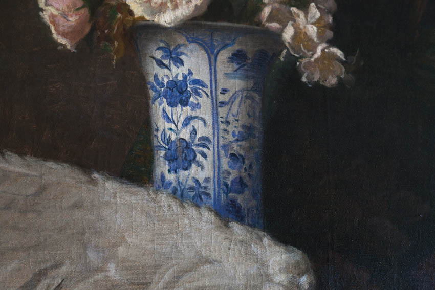A dead swan lying in front of a boar with an 18th century faience vase filled with roses and a water fountain in the background.