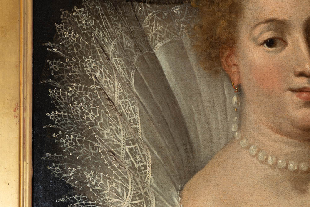 Portrait of a young woman in a red silk dress with a high Medici lace collar, pearl earrings and a pearl necklace.
