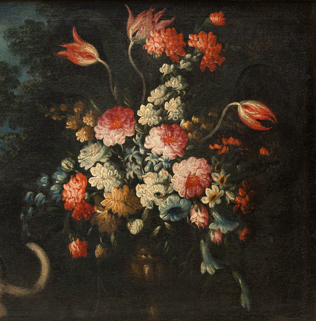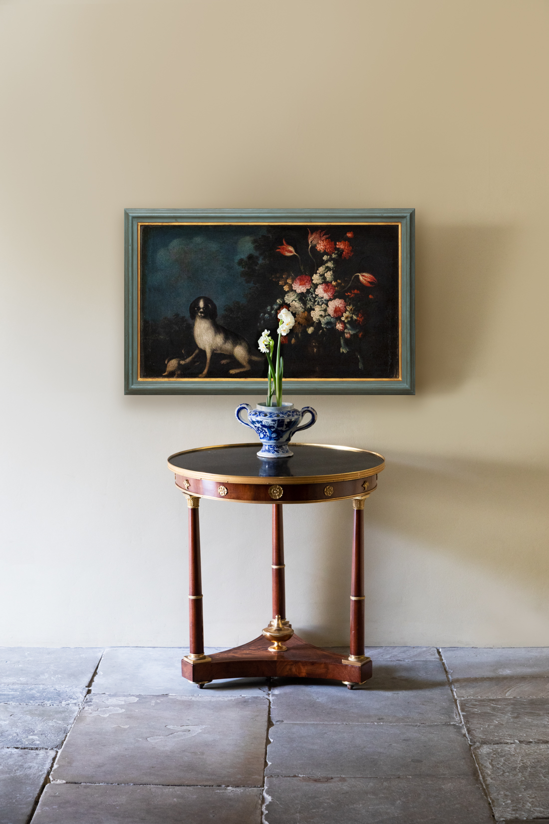 A black and white hunting dog with his catch, possibly a partridge sits in a wooded landscape with a bouquet of flowers to the right.