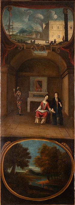 A set of six canvas's depicting stories and characters from the Commedia Dell'Arte.