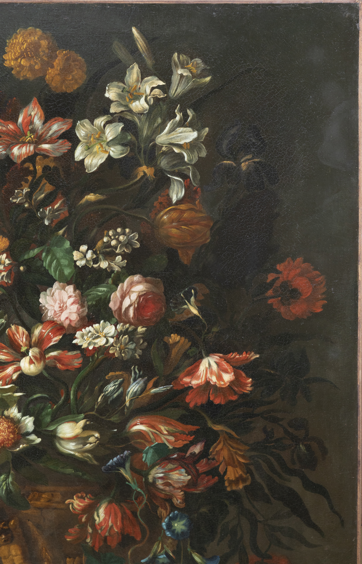 Flowers arranged in urns with mythological decoration in relief, against a landscape and seascape background.