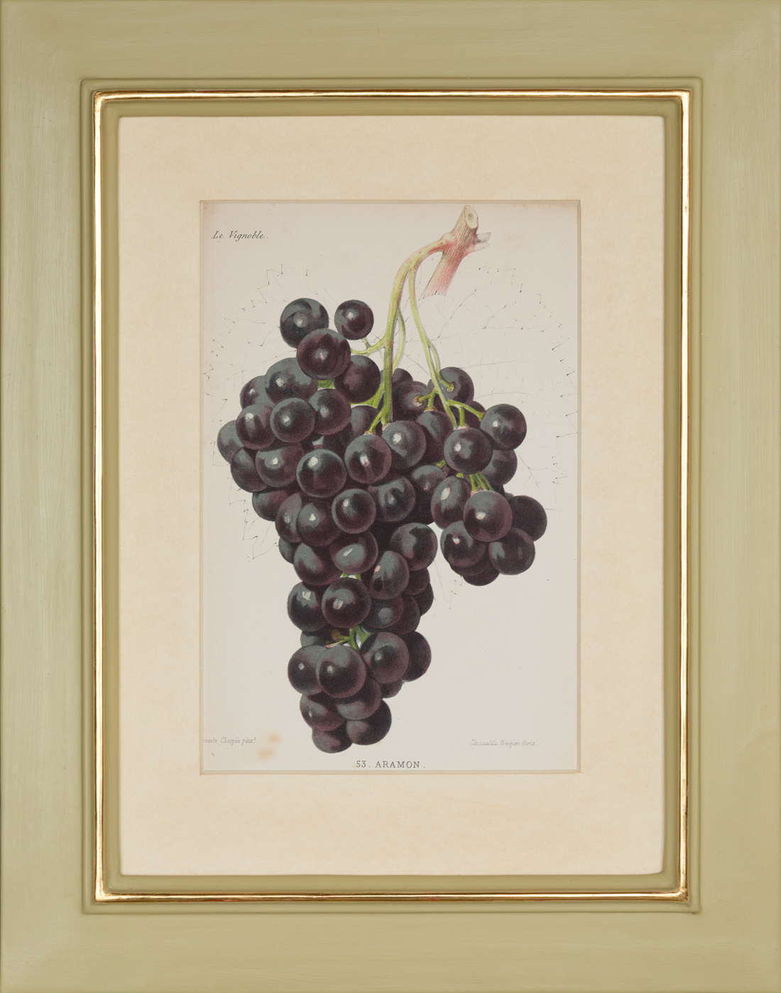 A SET OF TWELVE FRAMED 19TH CENTURY CHROMOLITHOGRAPHS FROM AN ENSEMBLE TITLED 'LE VIGNOBLE OU HISTOIRE, CULTURE ET DESCRIPTION... DES VIGNES A RAISINS DE TABLE ET A RAISINS DE CUVE'. Paris: Pierre Barbier for G.Masson, 1874-1879 'Aramon'